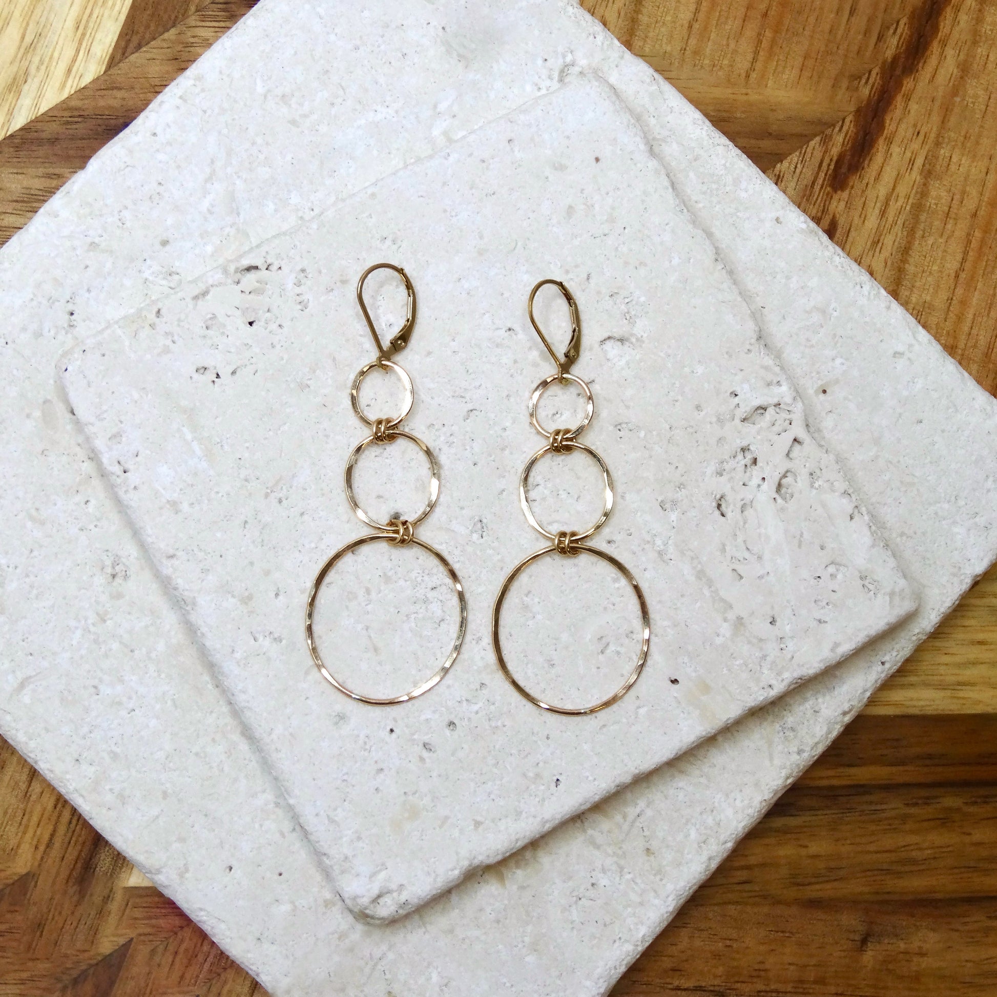 Three large light weight, hand forged, hammered & connected gold filled circle earrings