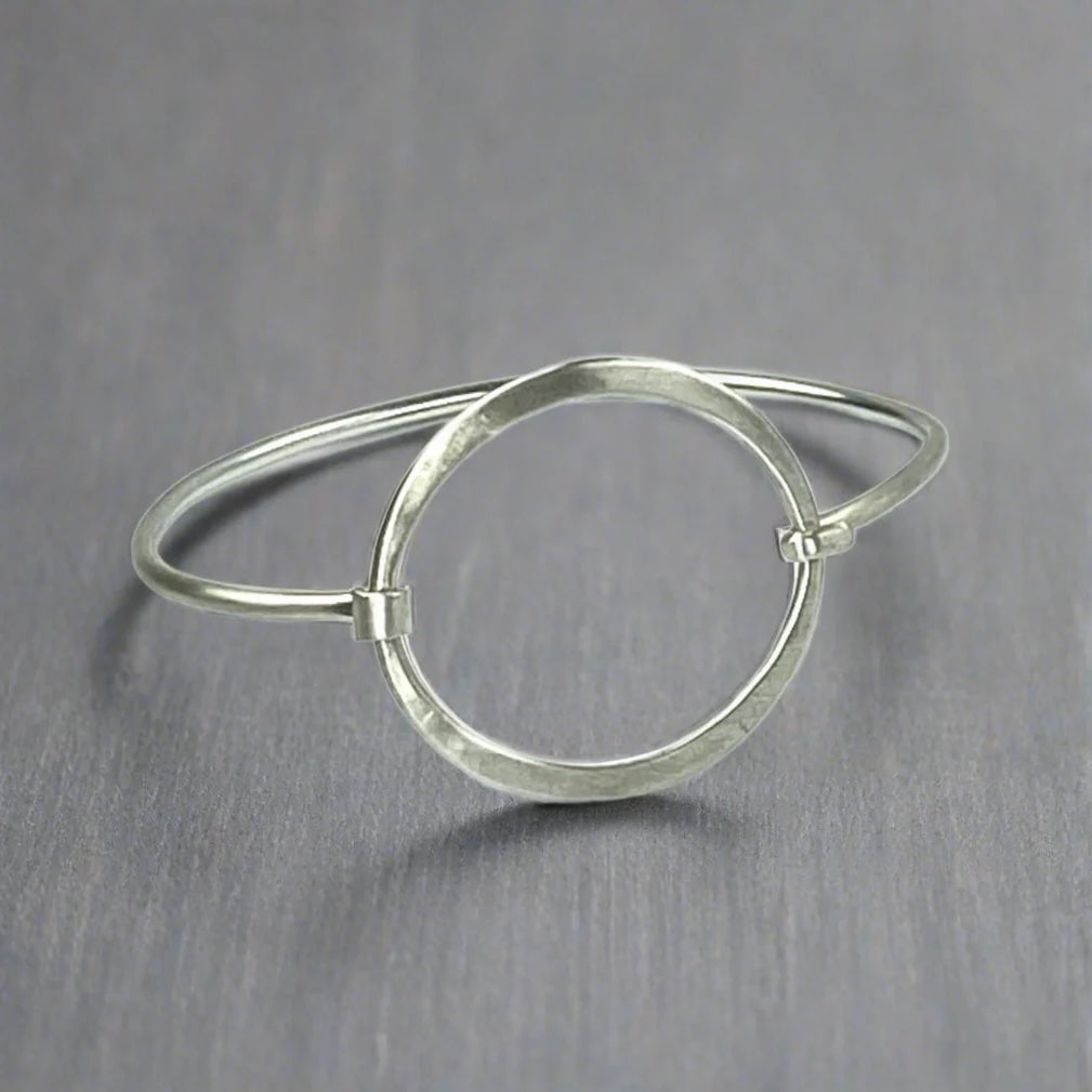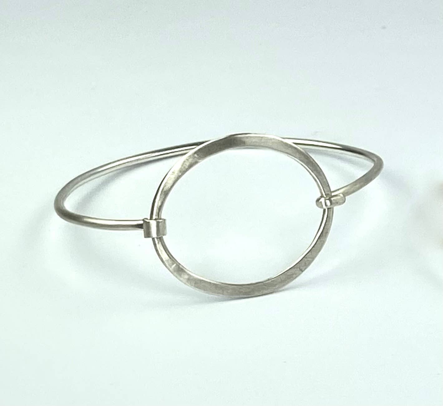 Kai bangle bracelet with a large sterling silver Kai circle and a sterling silver band bracelet and a hooked closure.