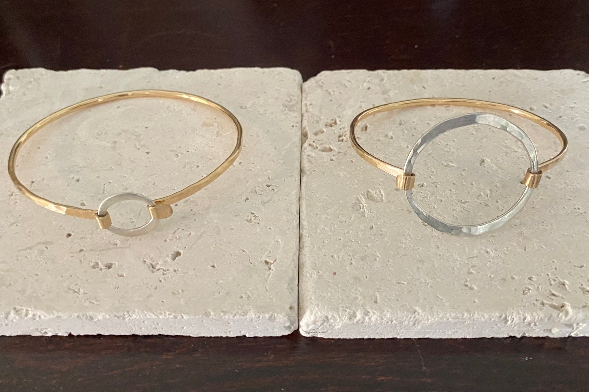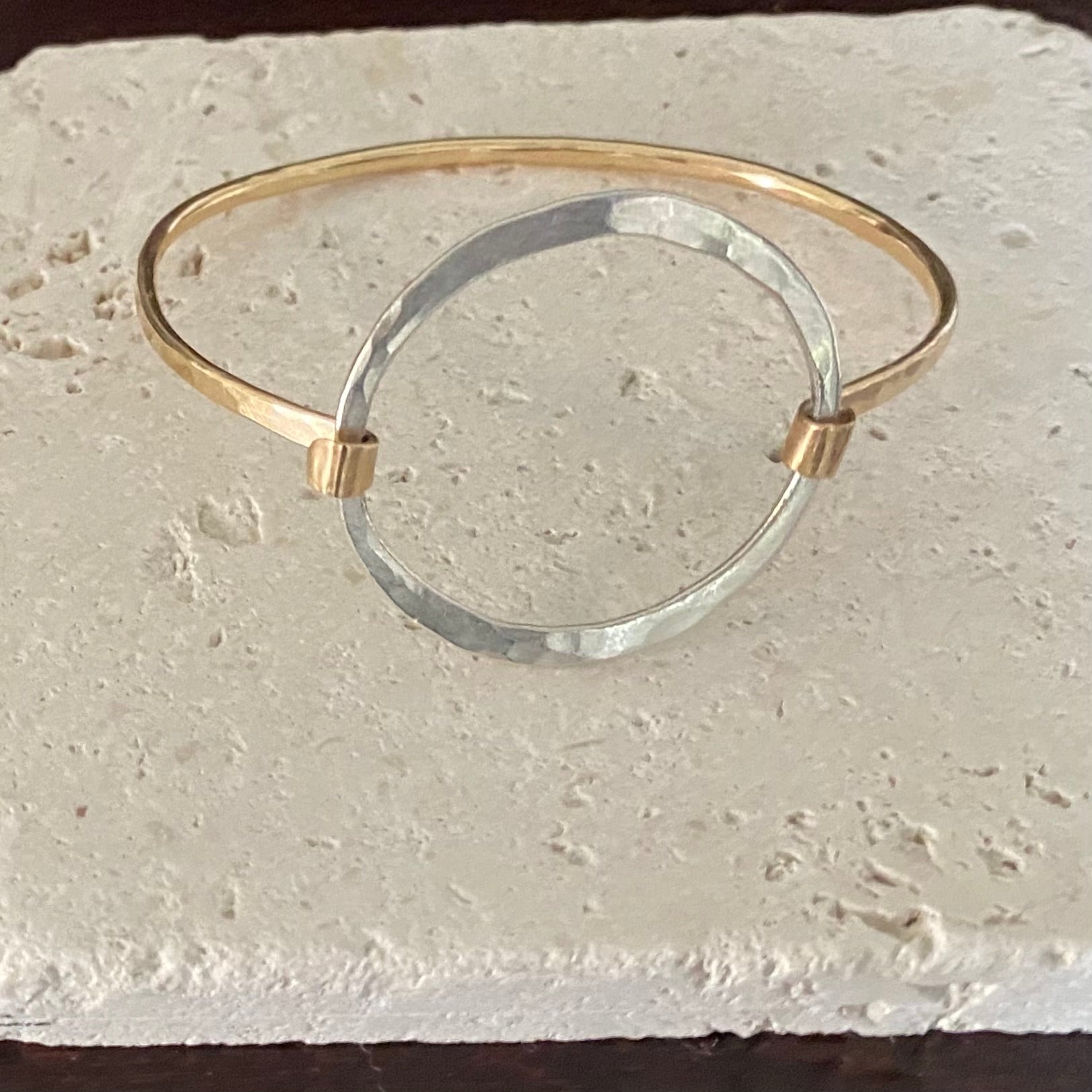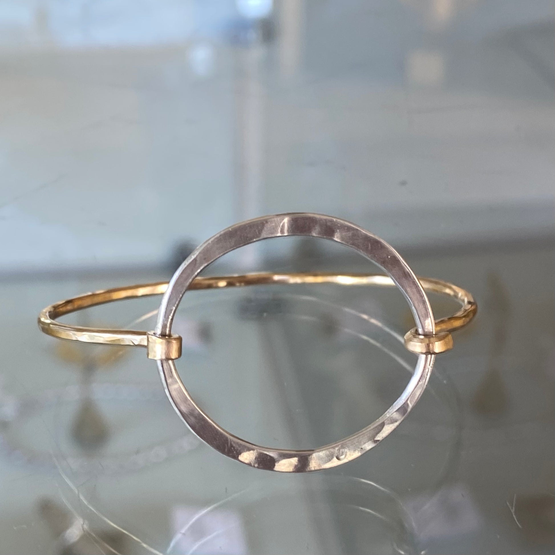 Kai bangle bracelet with a large sterling silver Kai circle and a gold filled band bracelet and a hooked closure.