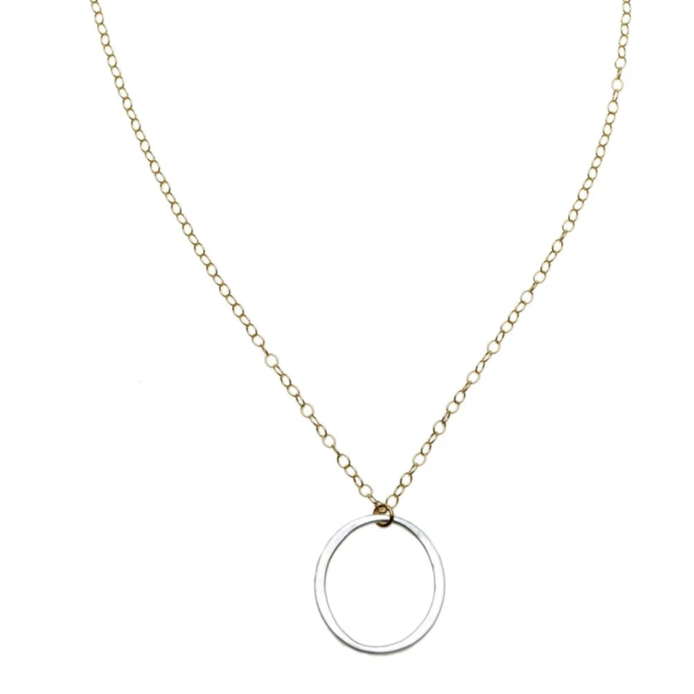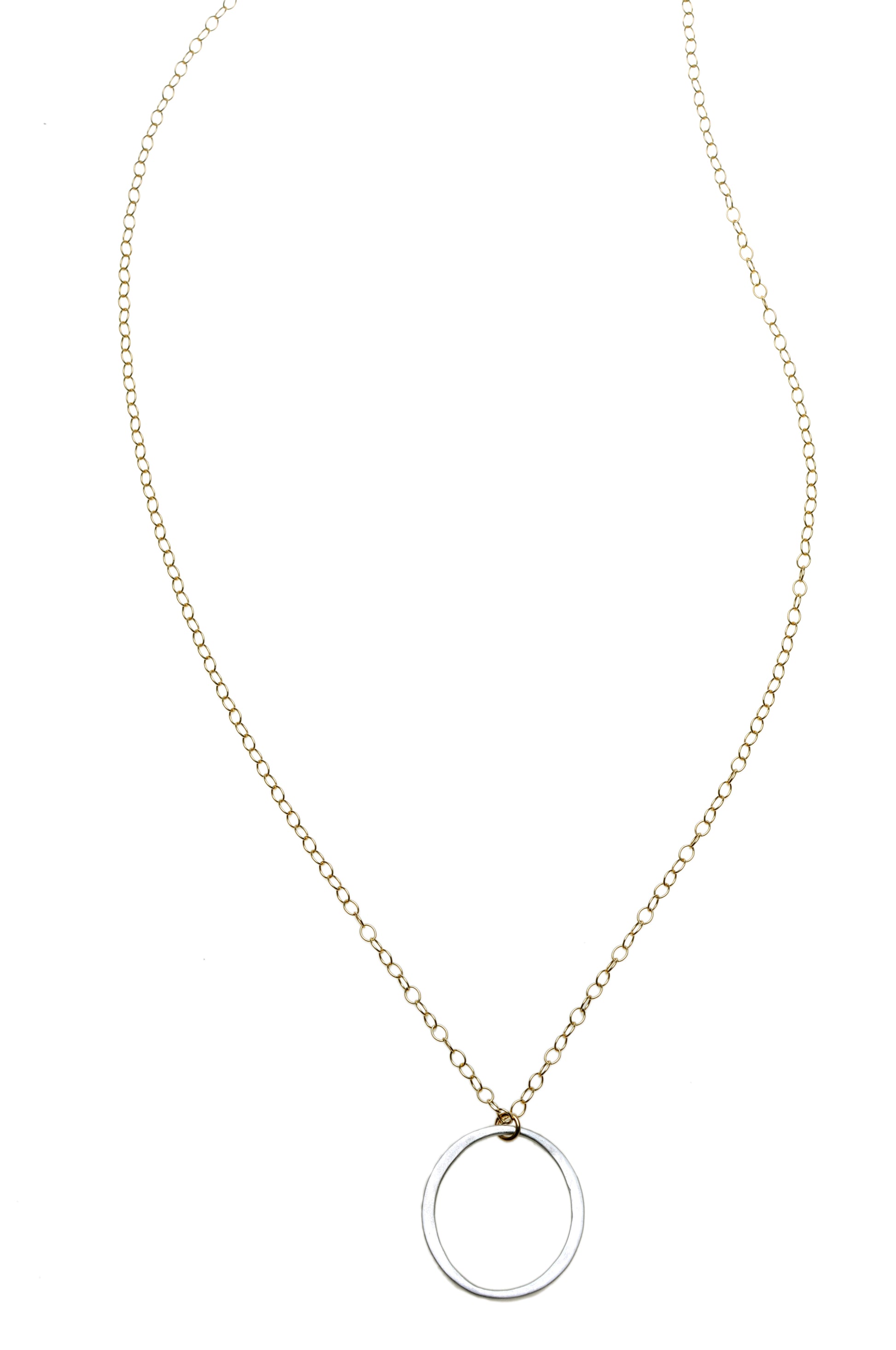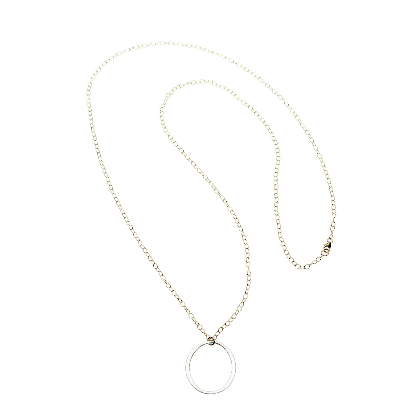 Large Kai sterling silver circle pendant on long 36" gold-filled open cable chain with a 2" extension and surprise gemstone accent.
