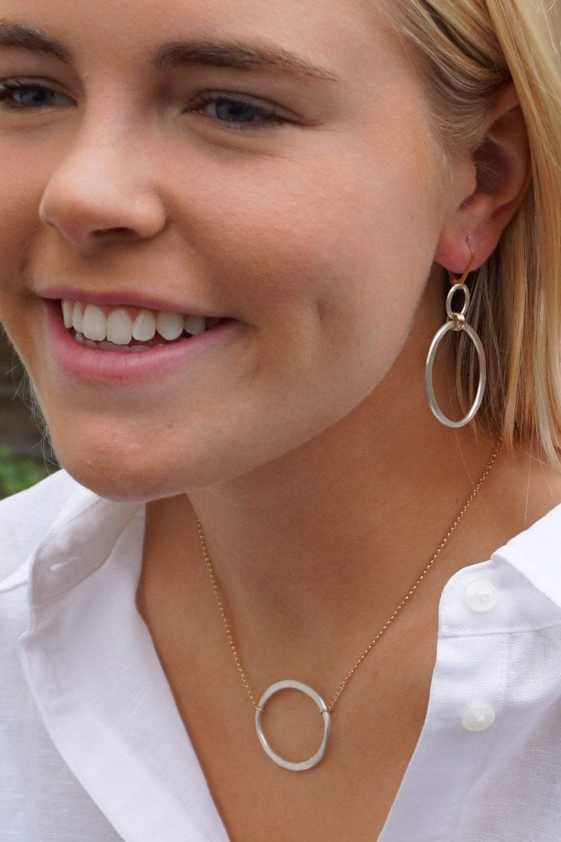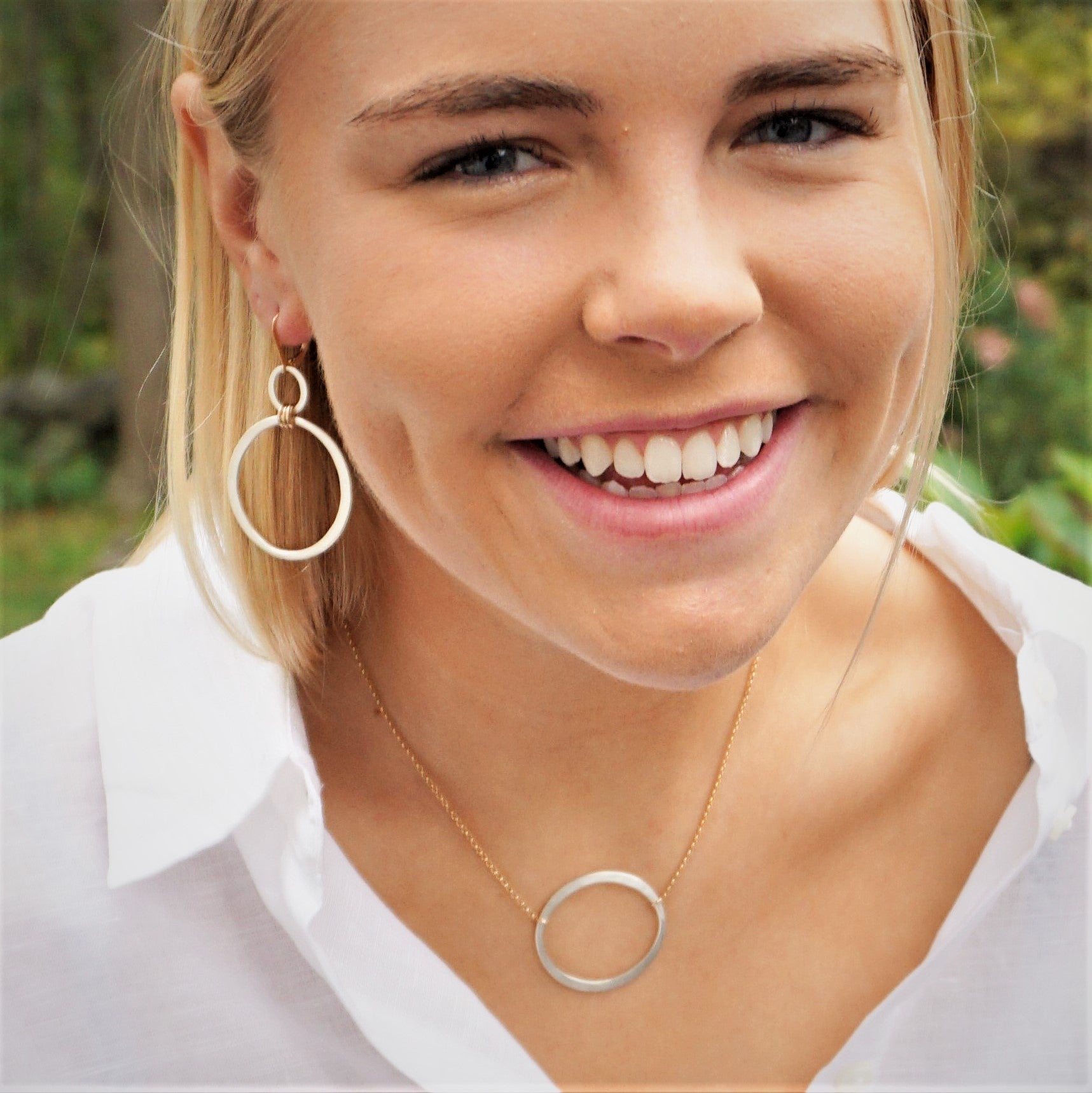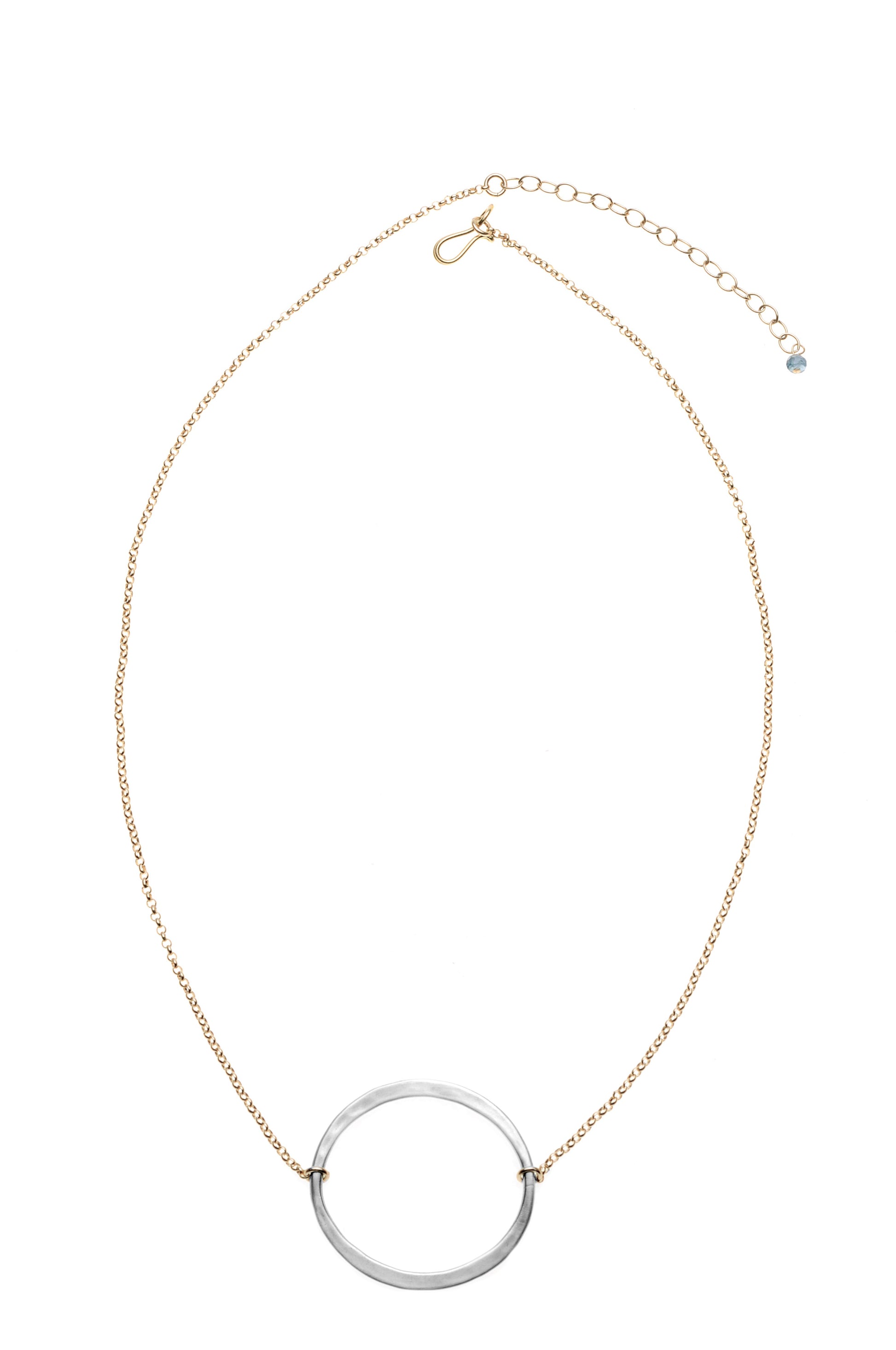Large hammered organic matte sterling silver circle on a gold-filled rolo chain with a 2" extension and surprise gemstone accent.