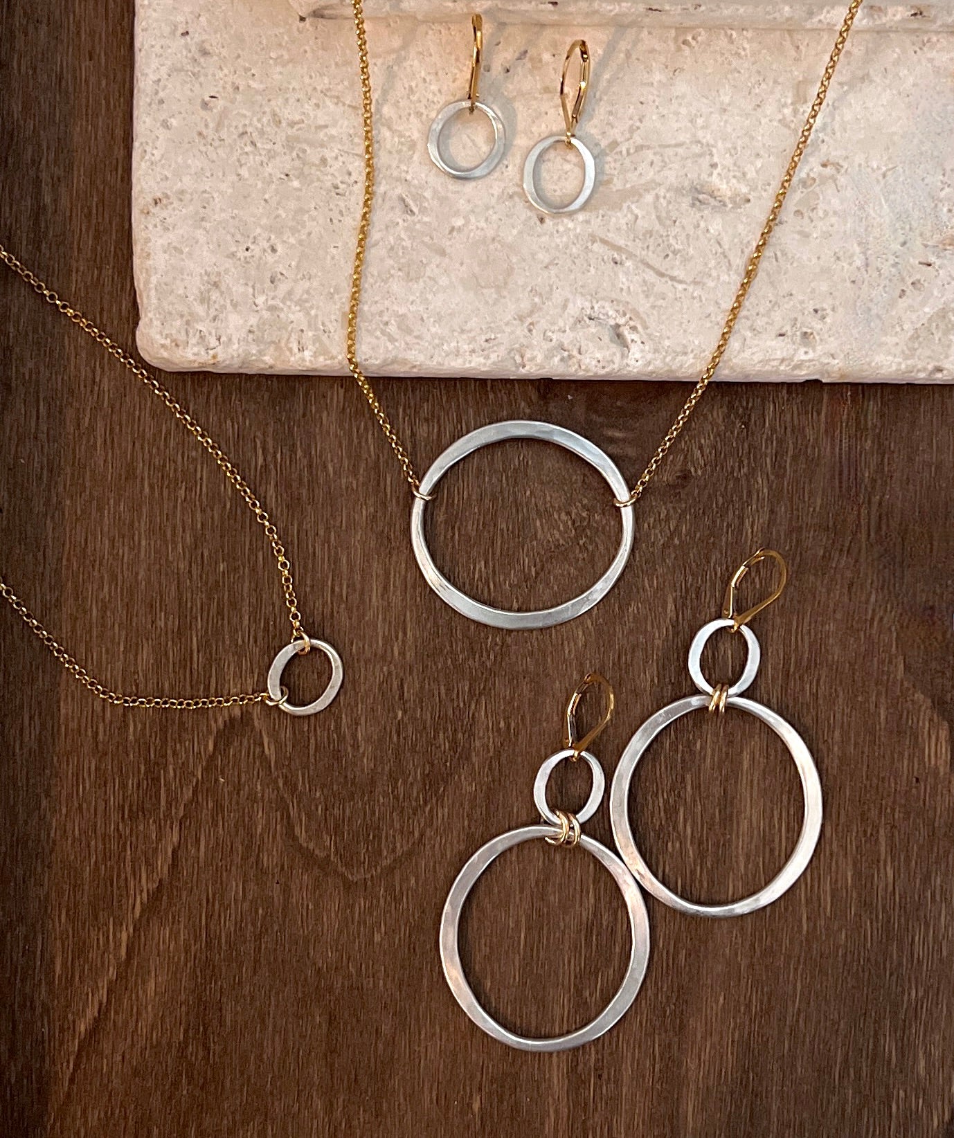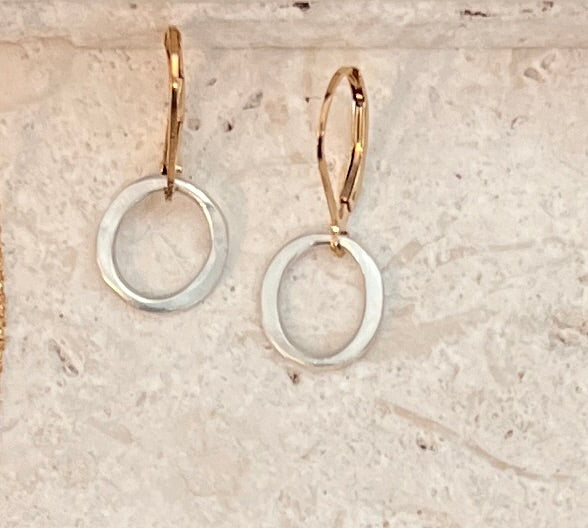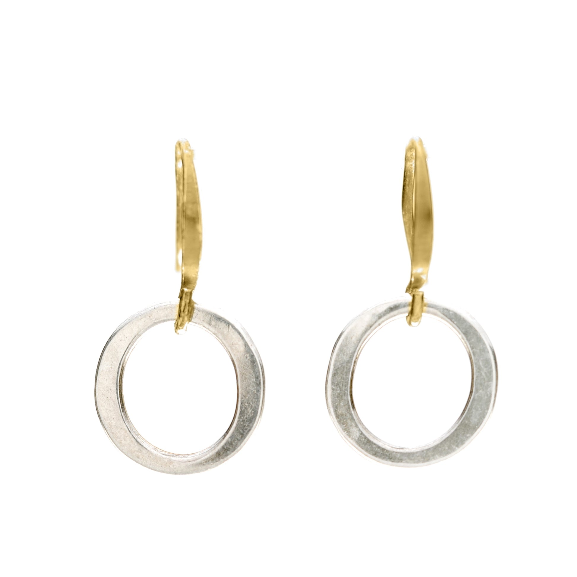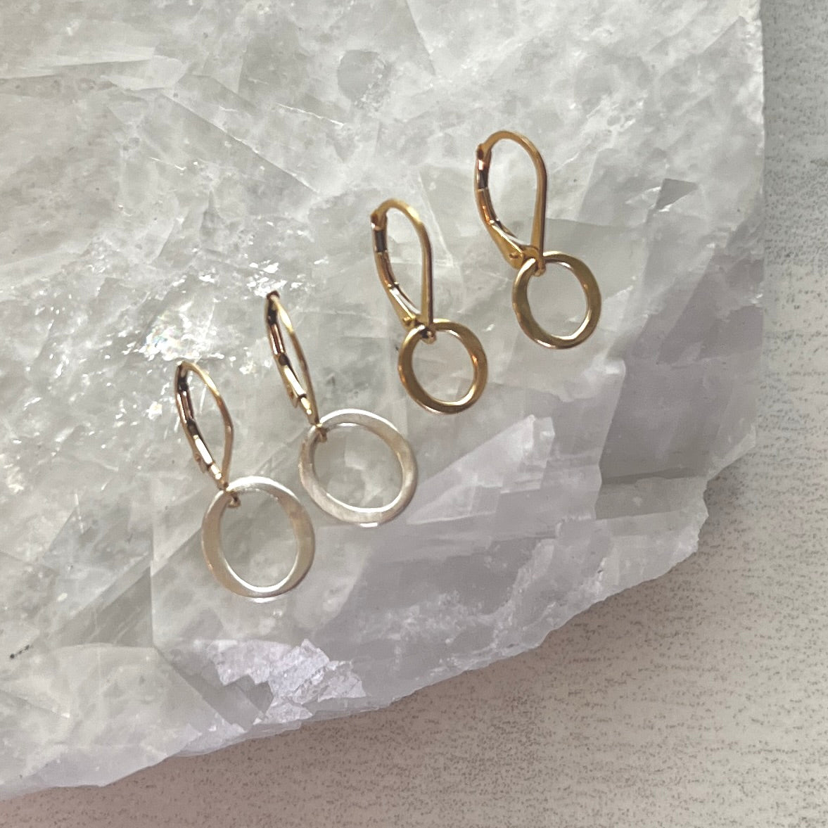 Petite matte sterling silver Kai circles on upgraded gold-filled lever backs.