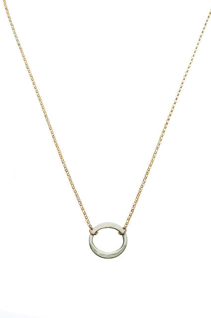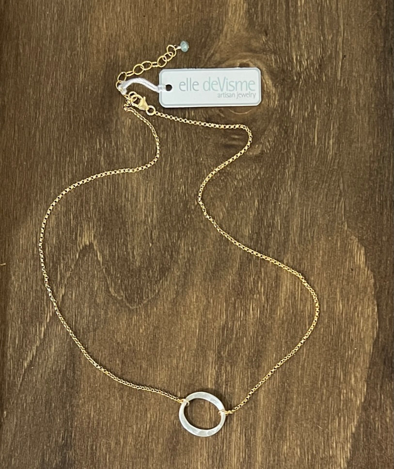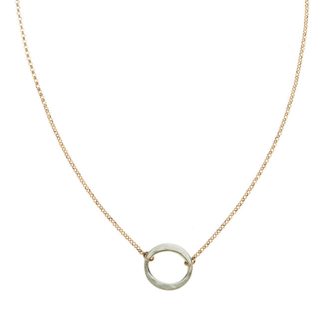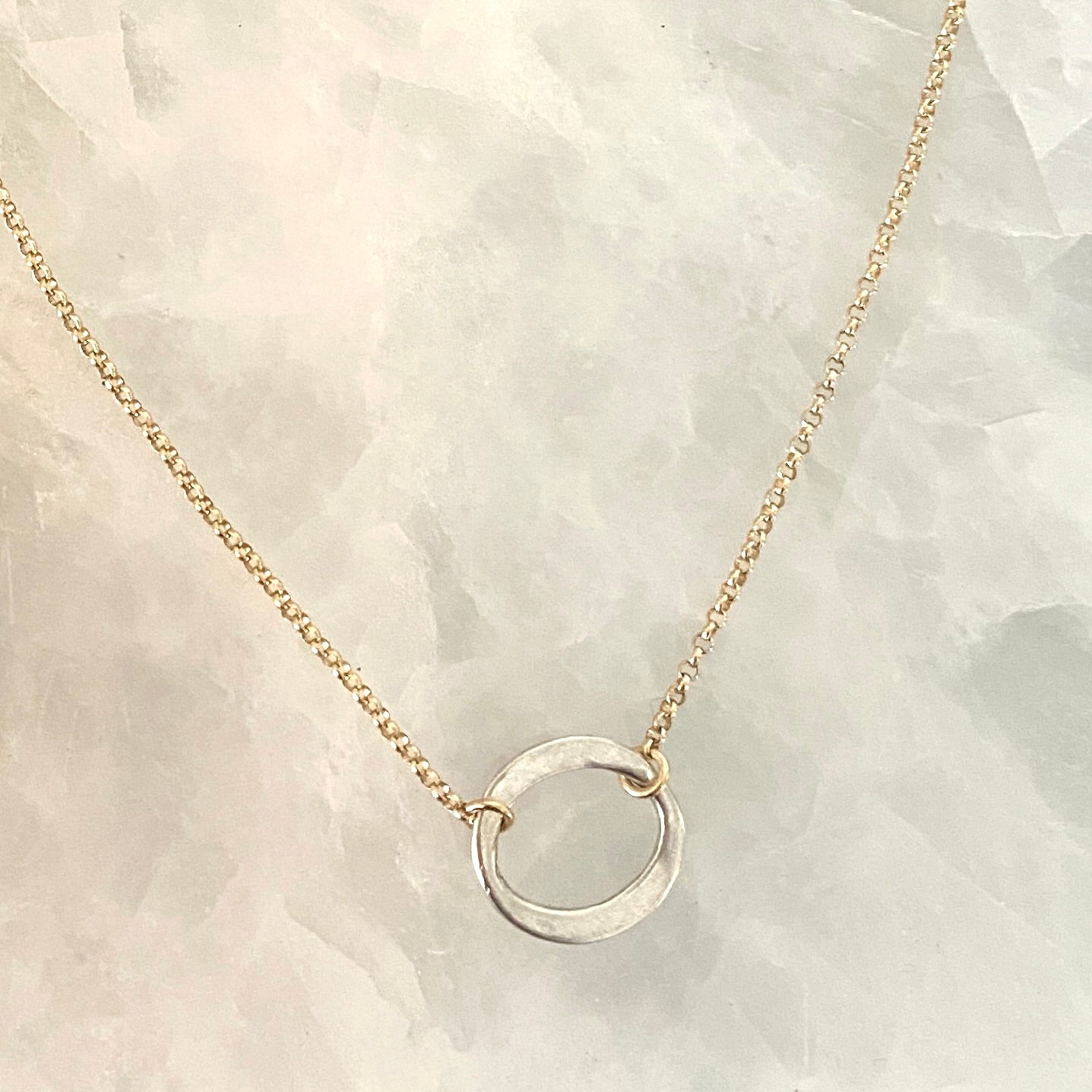 Small hammered organic matte sterling silver circle on a gold-filled rolo chain with a 2" extension and surprise gemstone accent.