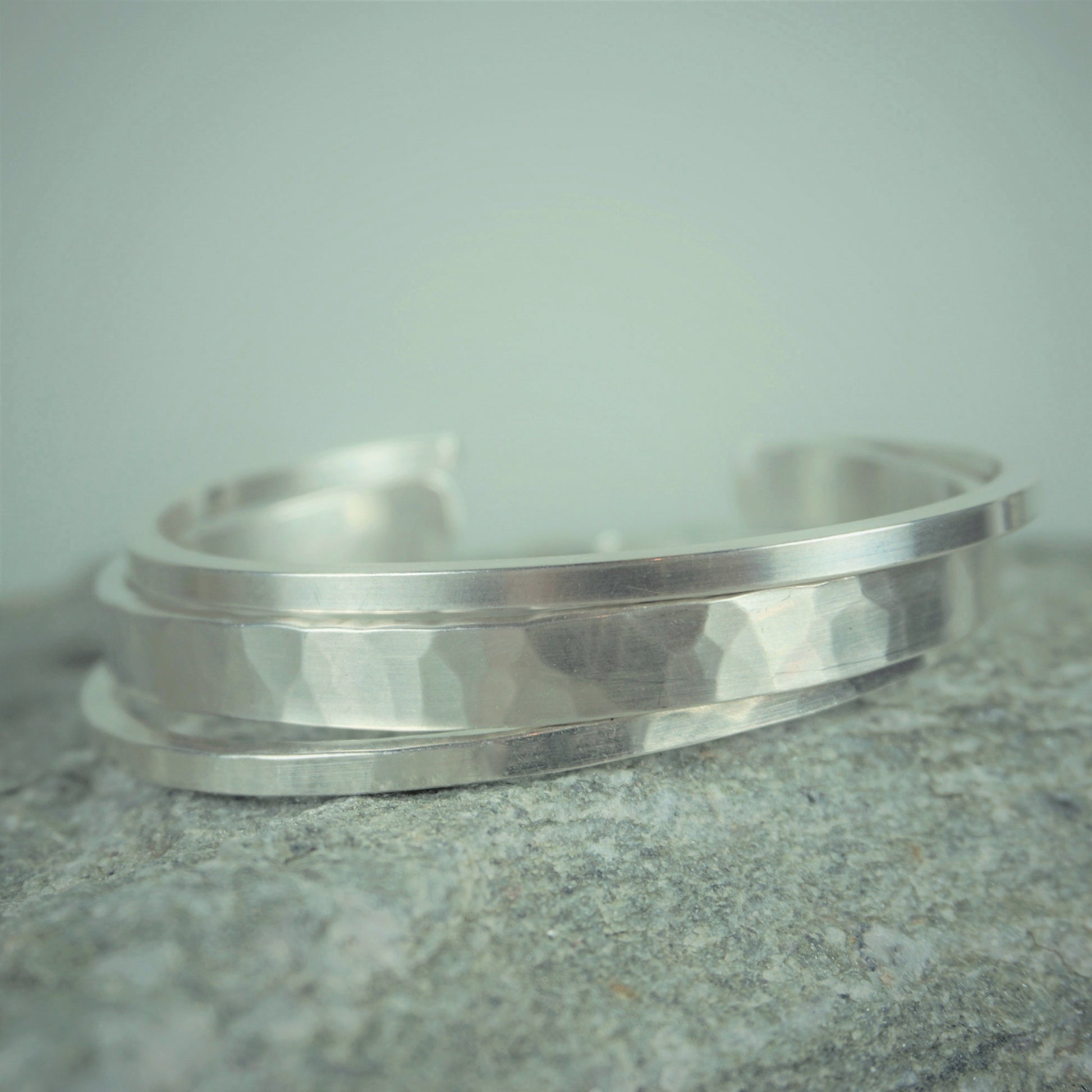 Hand forged 6mm wide x 2mm thick solid sterling silver cuff bracelet. Finished with a slight hammered texture and polished to a smooth creamy matte satin that can only be achieved by hand finishing. The end result is a truly unique hand-crafted piece with a rich artisanal component. Can be worn alone or purchased as a Meredith - 3 Band Cuff Set.