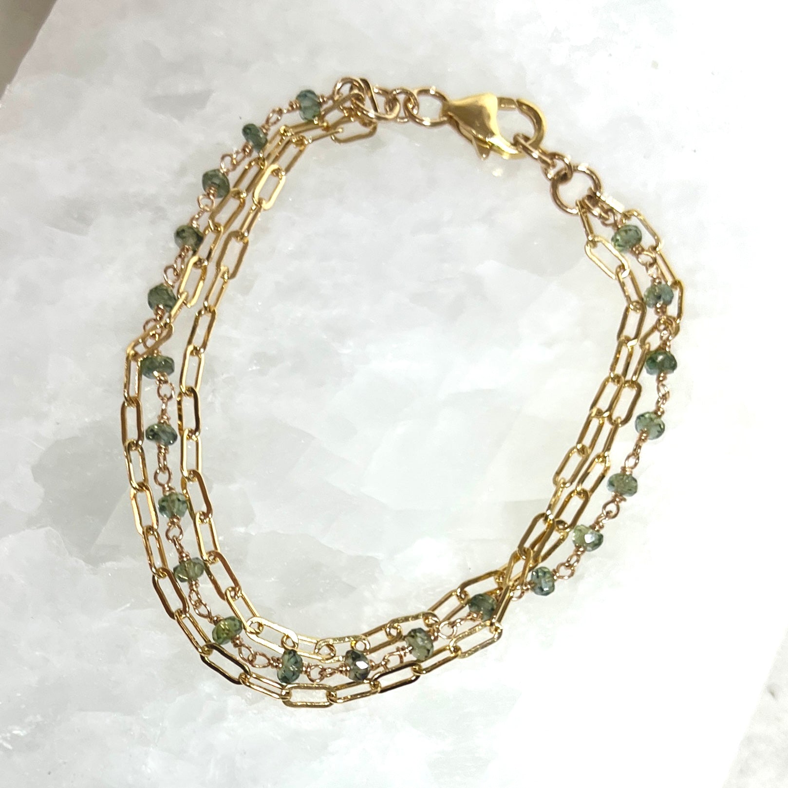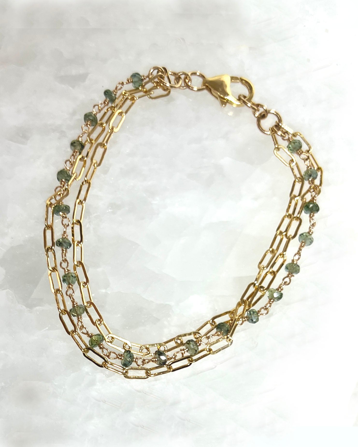 A natural green sapphire gemstone chain paired with two Sovereign paperclip drawn cable chains come together for an amazing 3 strand luxe look that will turn heads. For order in gold filled or sterling silver.