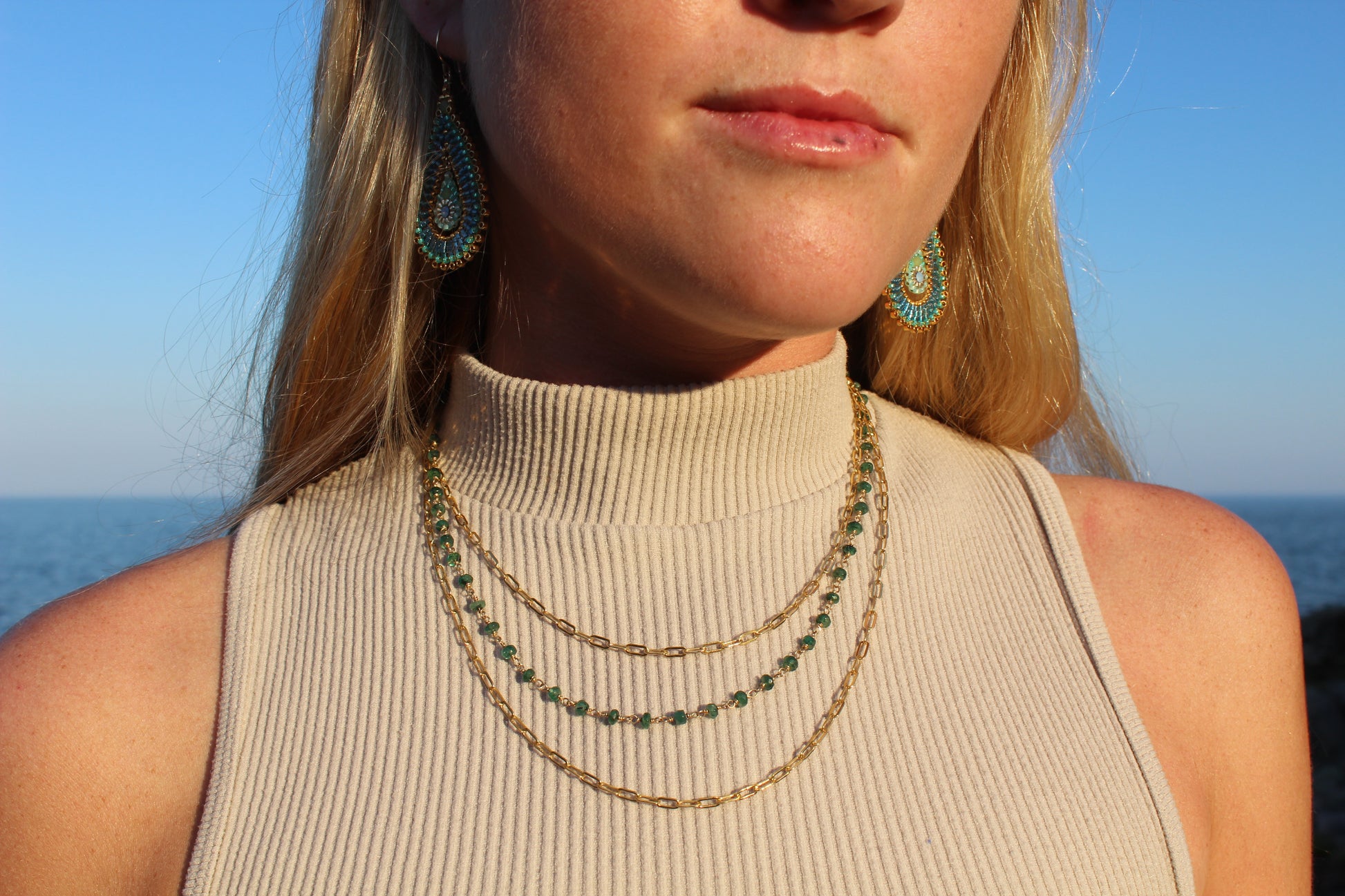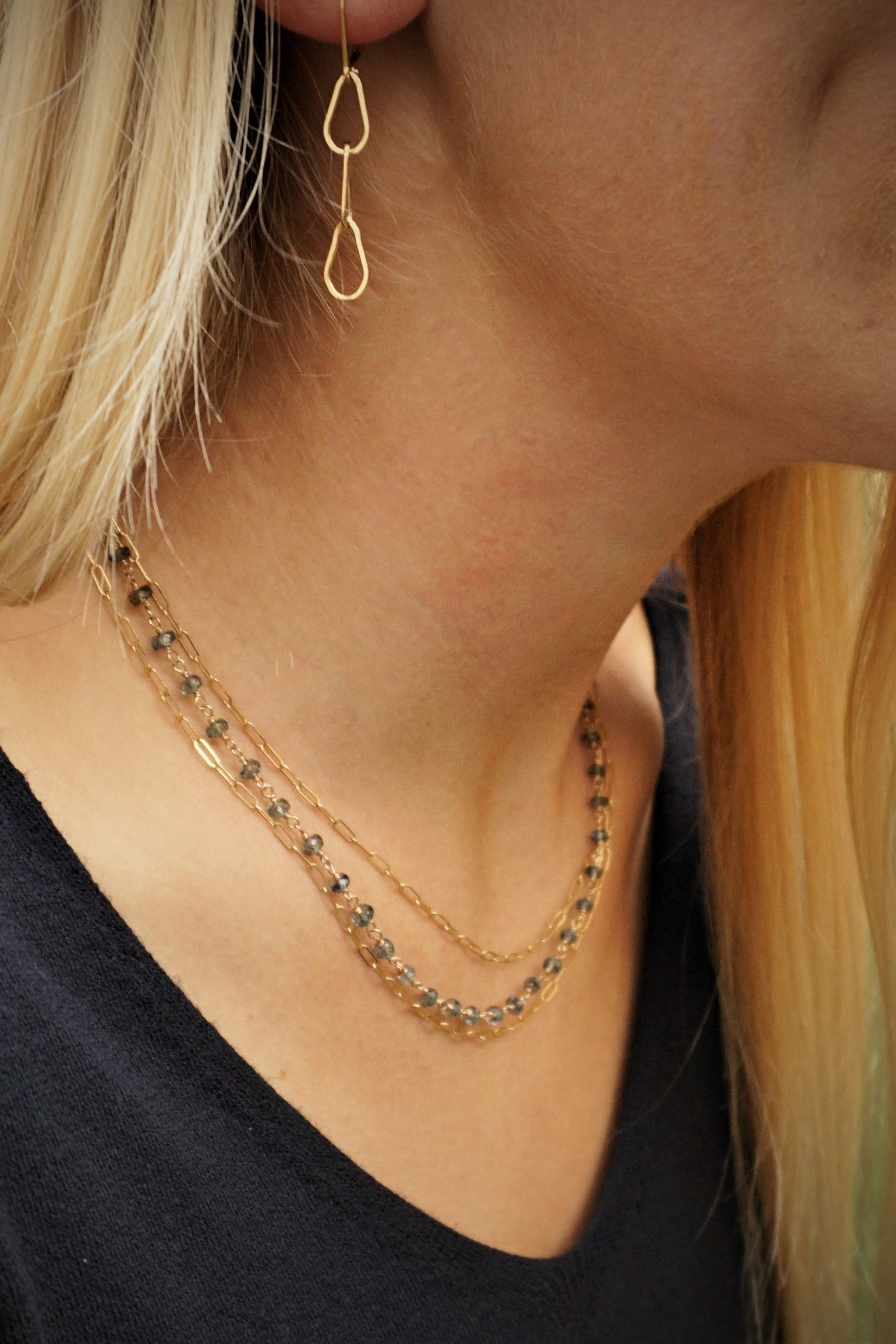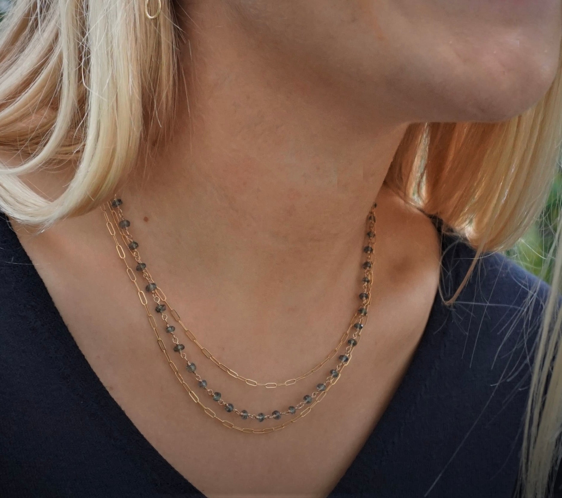 A green sapphire chain paired paired with two Sovereign graduating length paper clip drawn cable chains come together for an amazing 3 strand luxe and on-trend layer look that will turn heads. A lobster clasp combined with a 2" extension allows for a flexible adjustable piece. For order in gold filled or sterling silver.
