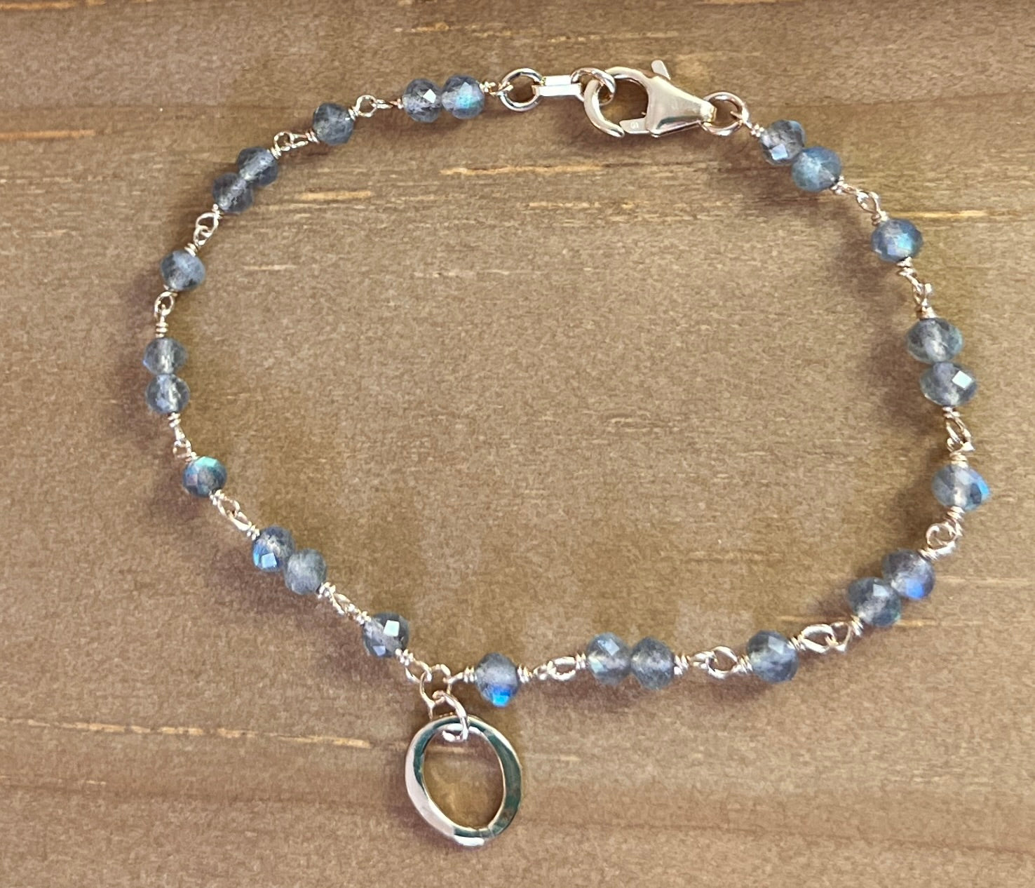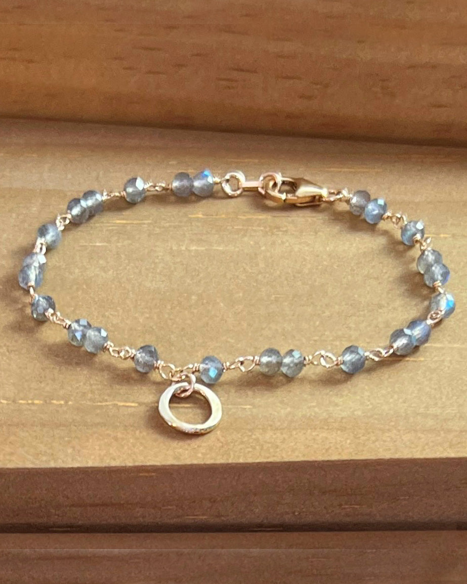 A bright blue flash micro-cut labradorite gemstone chain features a petite mini gold-filled Kai circle charm.