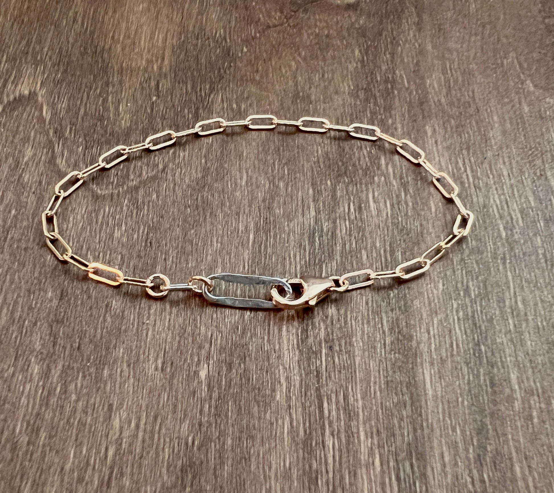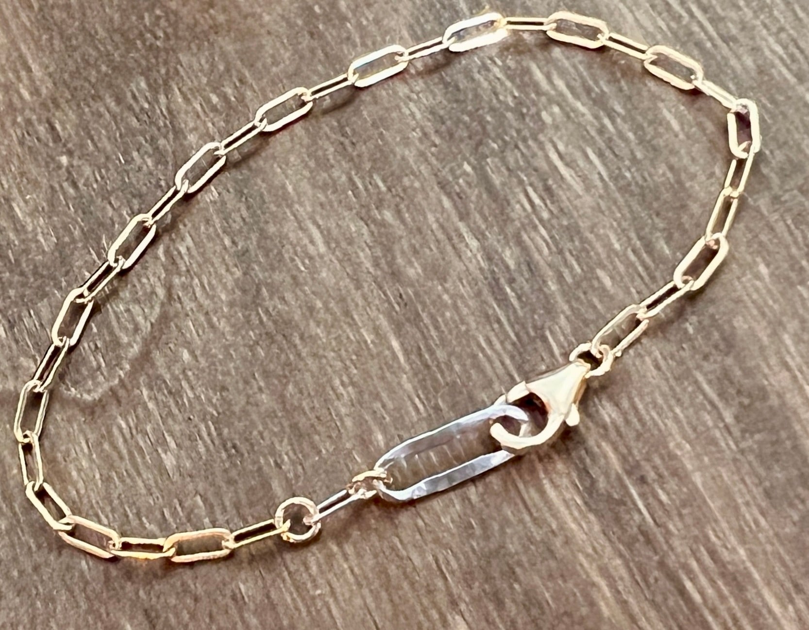 The Small Sovereign mixed metal bracelet features shining 6mm x 2.5mm gold filled links. This rectangle shaped drawn flat cable chain is accented with a sterling silver hammered artisan eye and finished with a large lobster clasp.