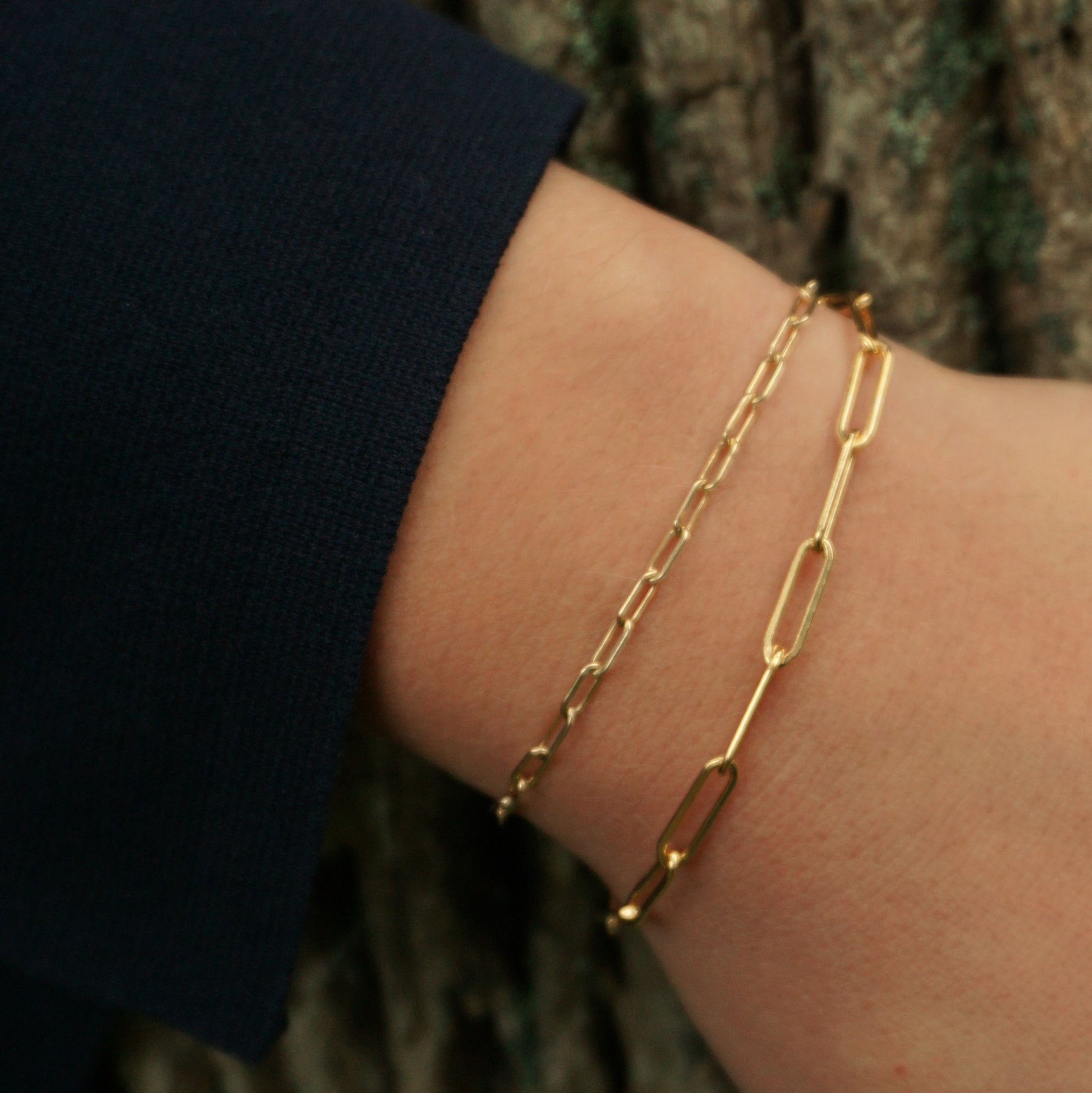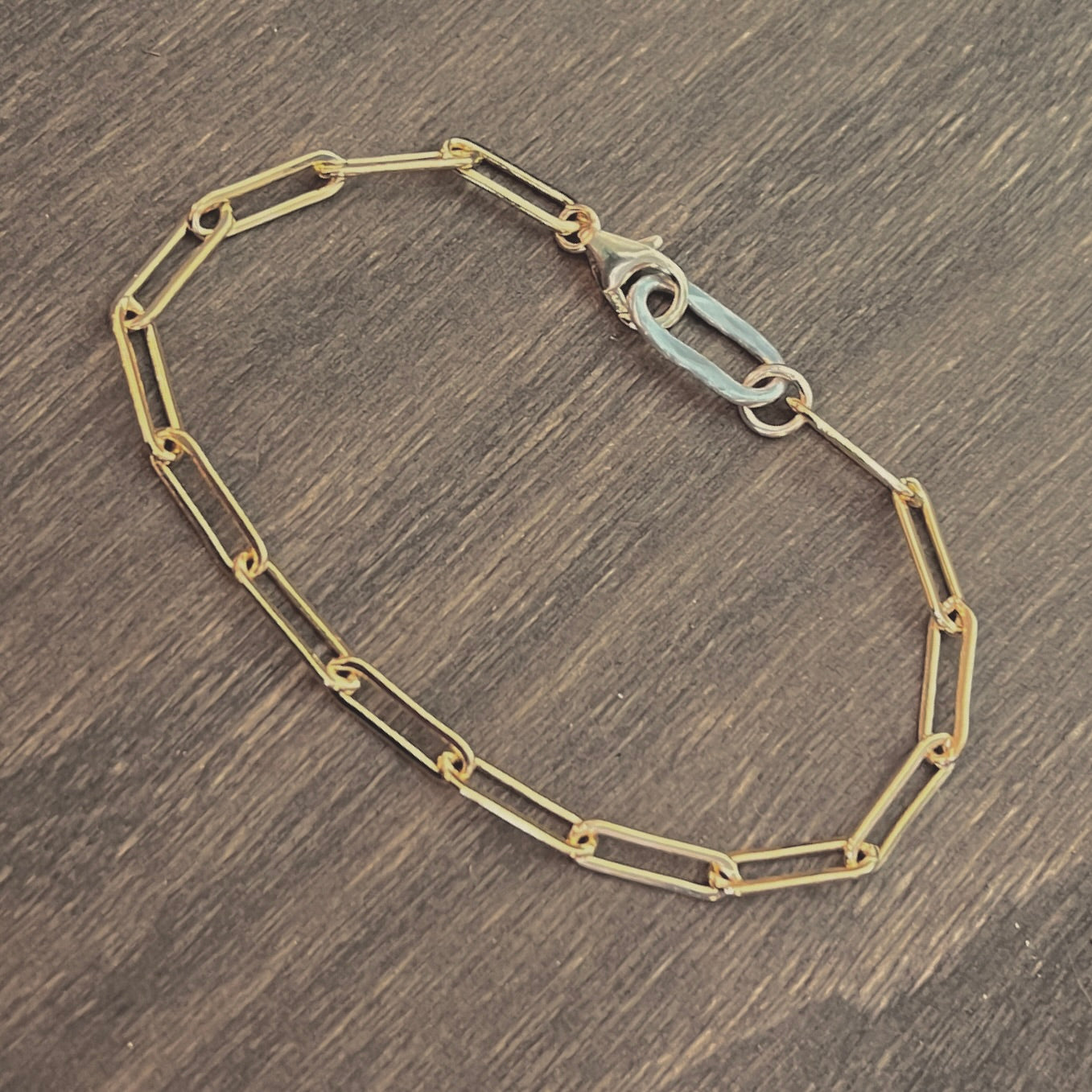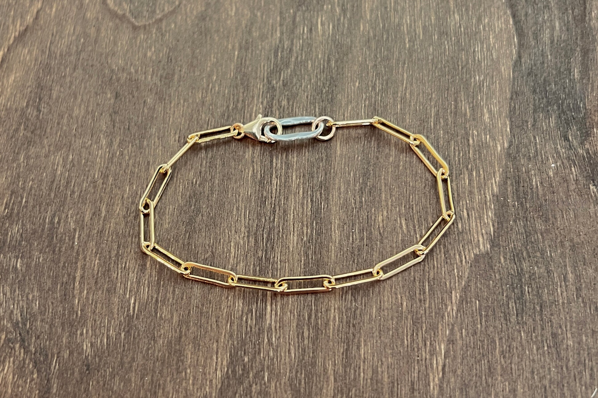 The XL Sovereign mixed metal bracelet features shining 13mm x 4mm gold filled links. This rectangle shaped drawn flat cable chain is accented with a sterling silver hammered artisan eye and finished with a large lobster clasp.