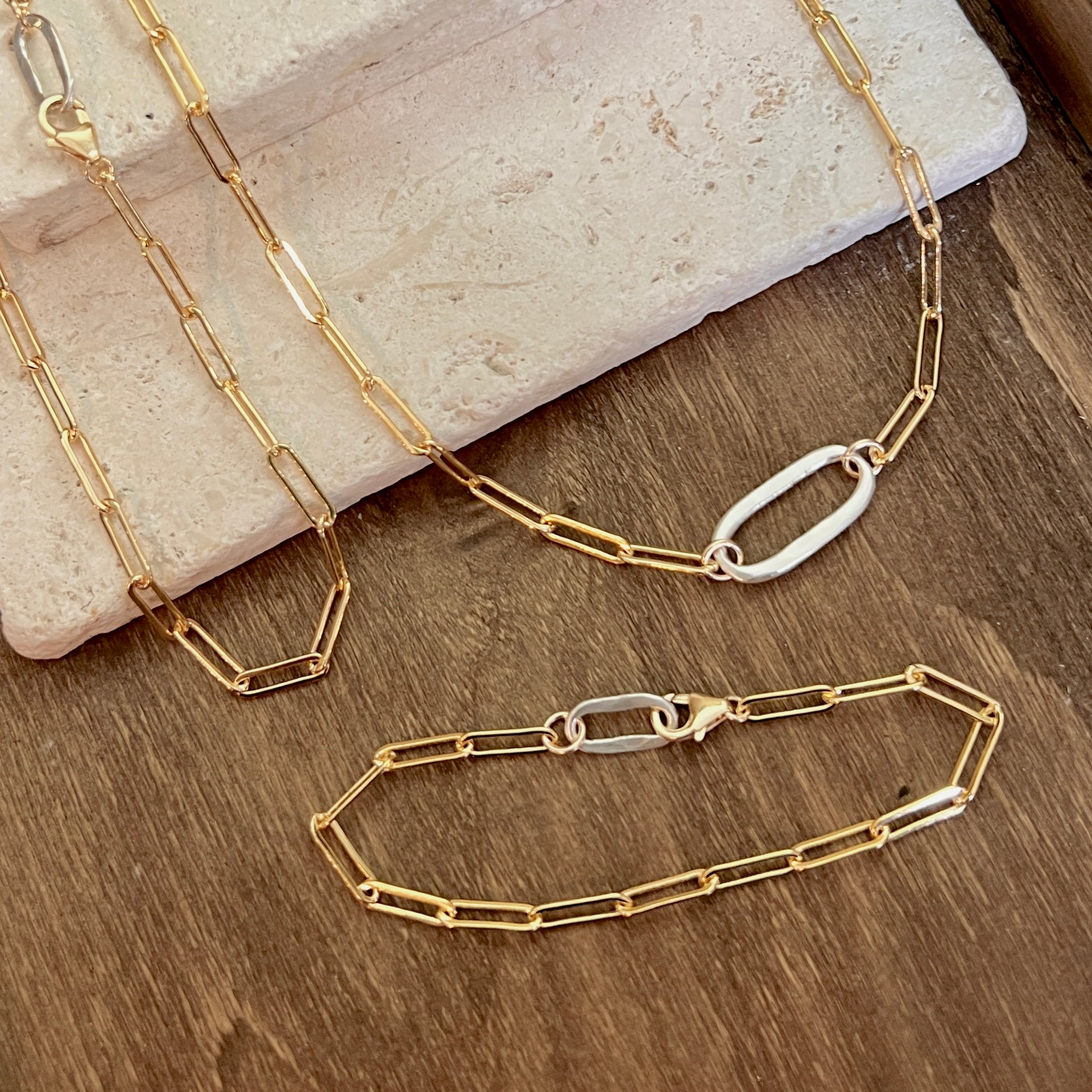 The paperclip chain is still wildly popular and the mixed metal Sovereign Collection offers a fresh and unique option that takes this trend to an even higher level of style. A hand forged hammered link is inset in the chain or used as the eye end of the clasp to add an artistic component not found in a typical paperclip necklace or bracelet.