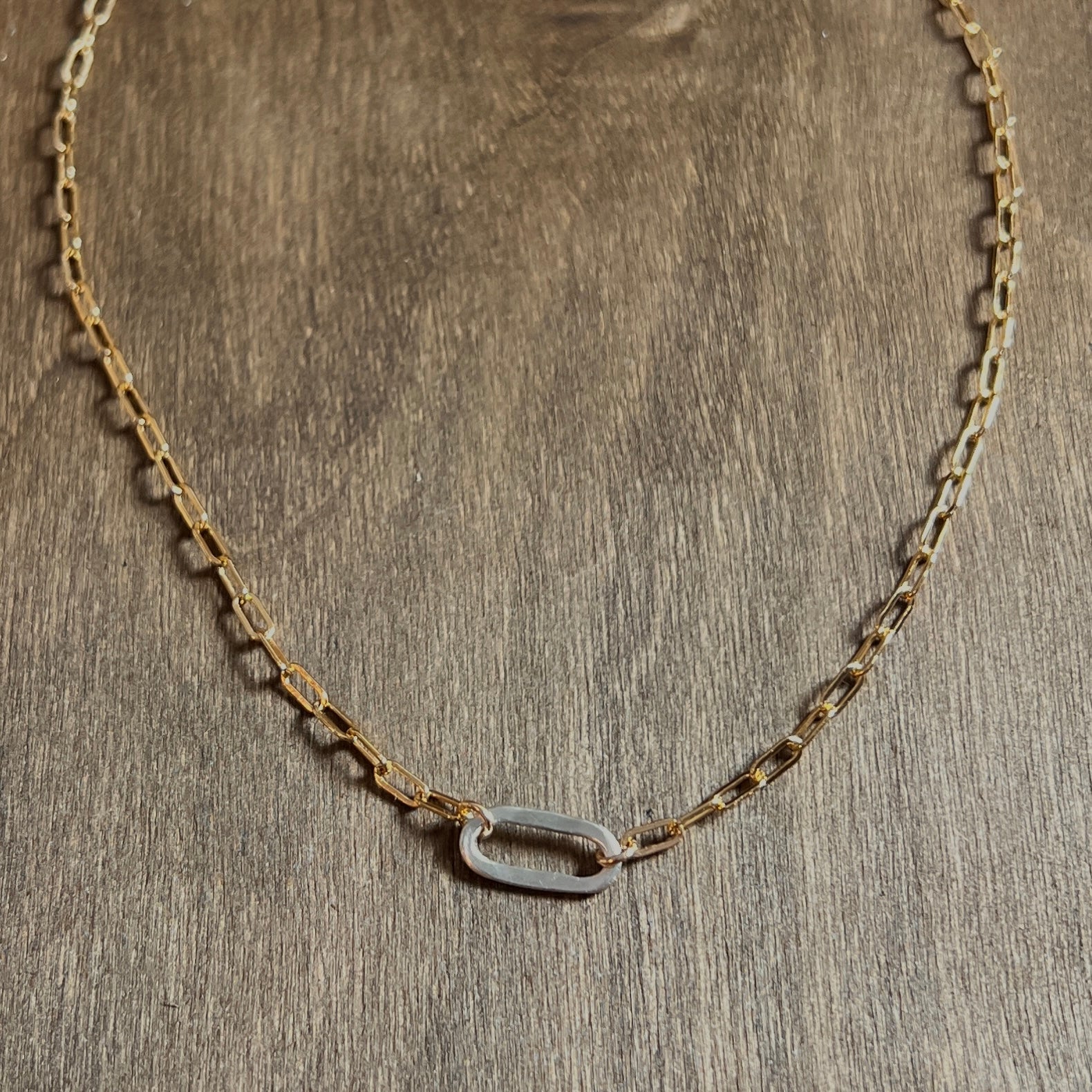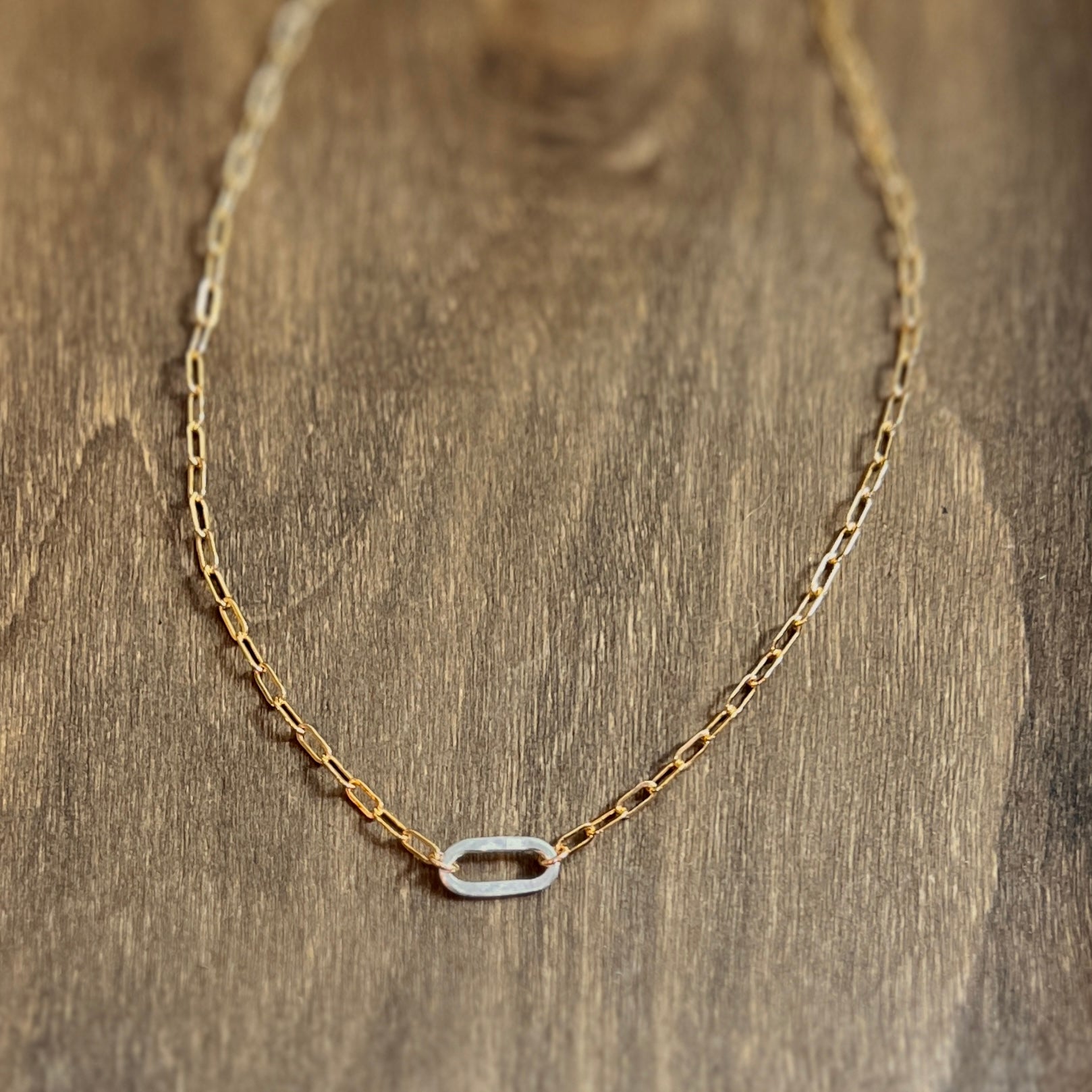 The Small Sovereign mixed metal necklace features shining 6mm x 2.5mm gold filled links. This rectangle shaped drawn flat cable chain is accented with a sterling silver hammered artisan link that is inset in the chain and finished with a large lobster clasp.