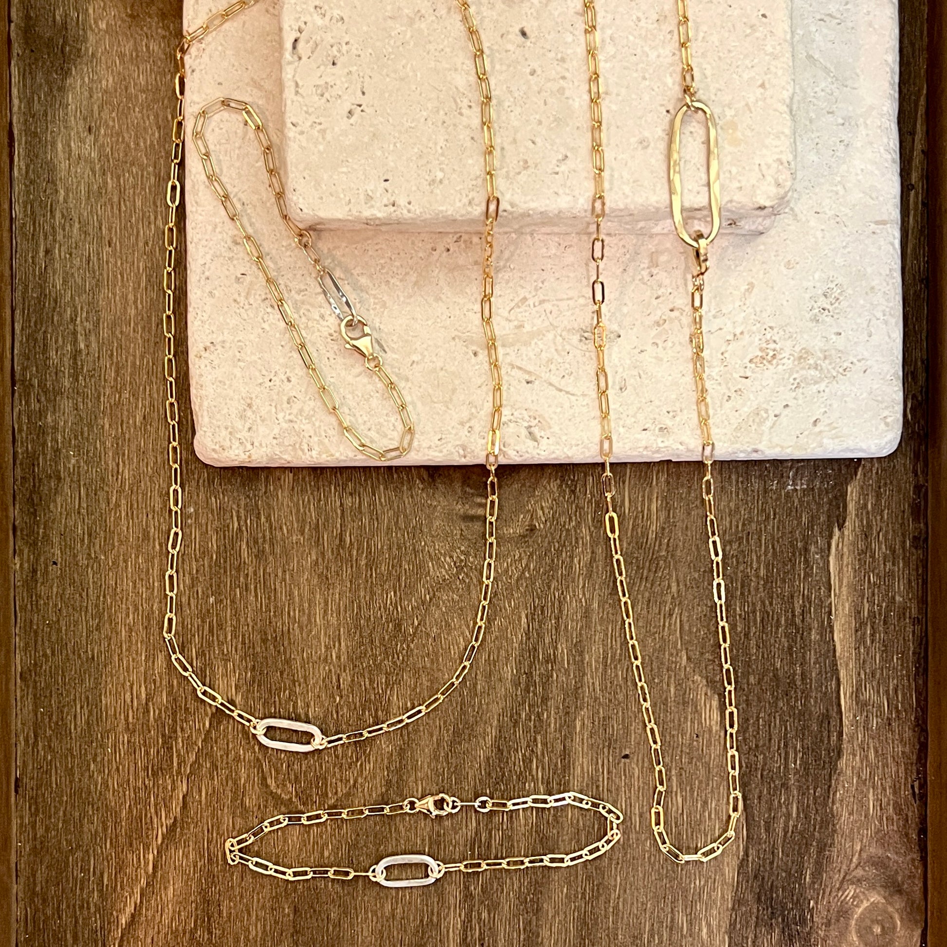 The paperclip chain is still wildly popular and the mixed metal Sovereign Collection offers a fresh and unique option that takes this trend to an even higher level of style. A hand forged hammered link is inset in the chain or used as the eye end of the clasp to add an artistic component not found in a typical paperclip necklace or bracelet.