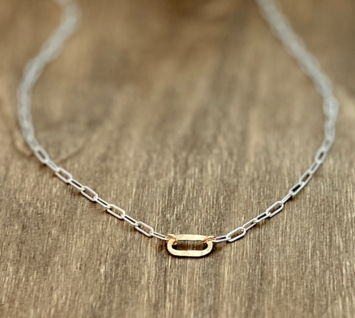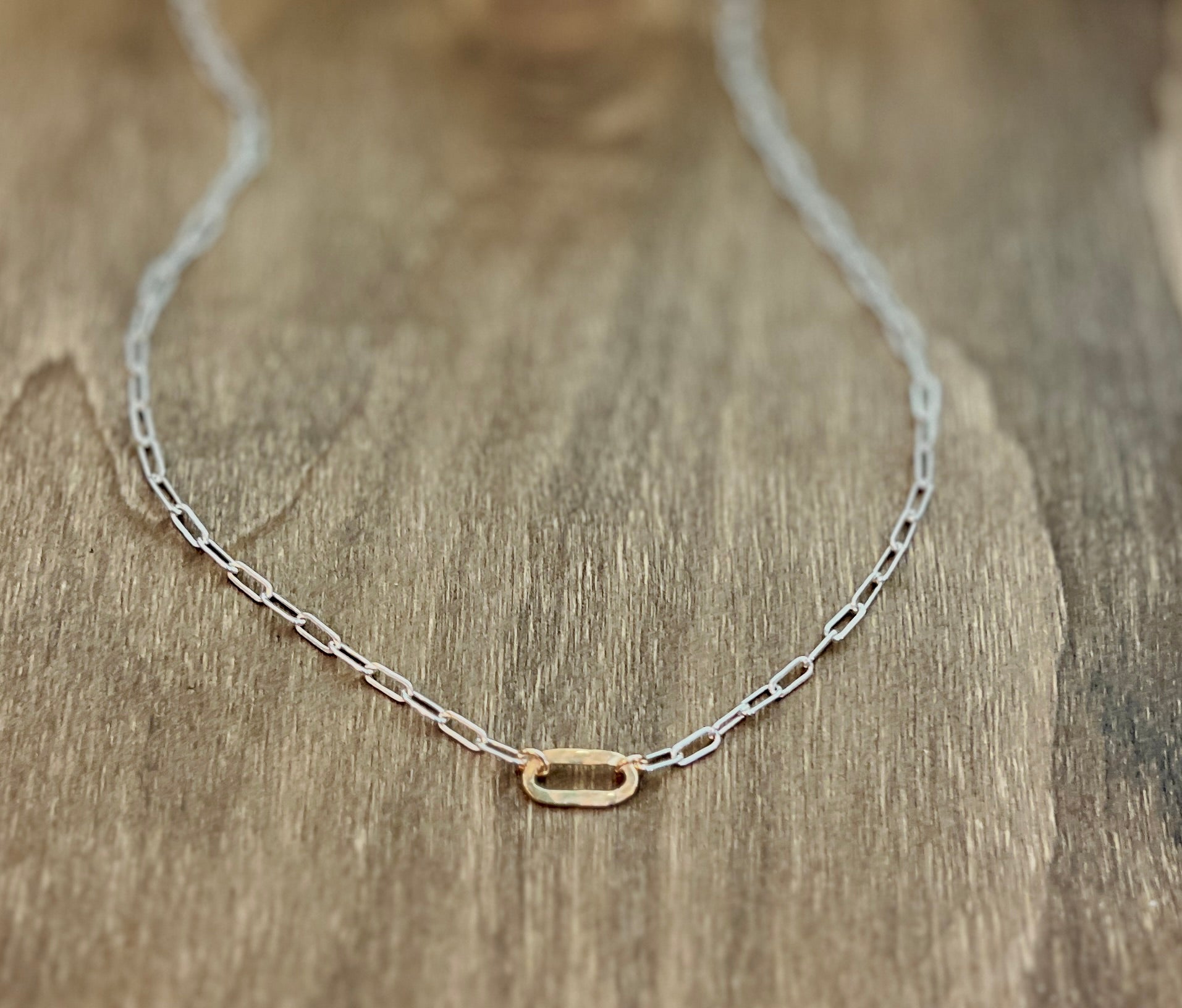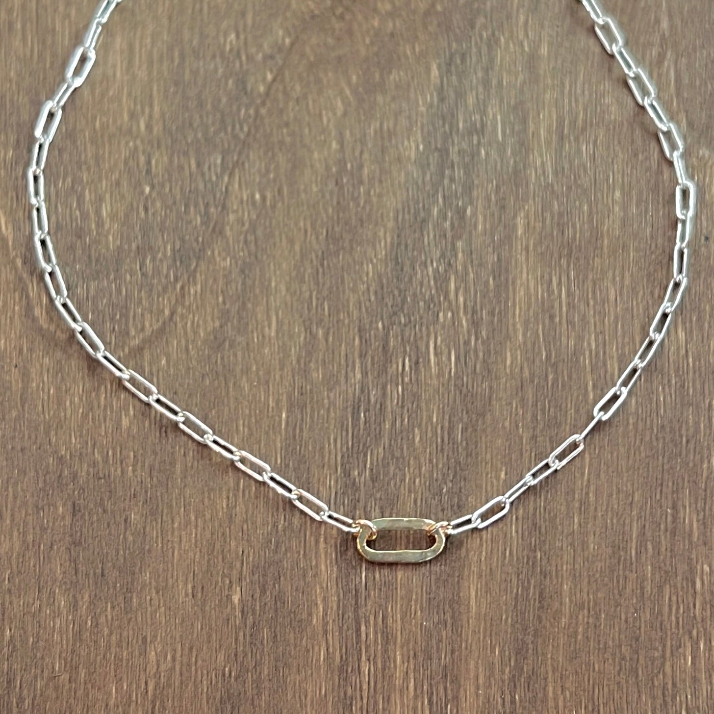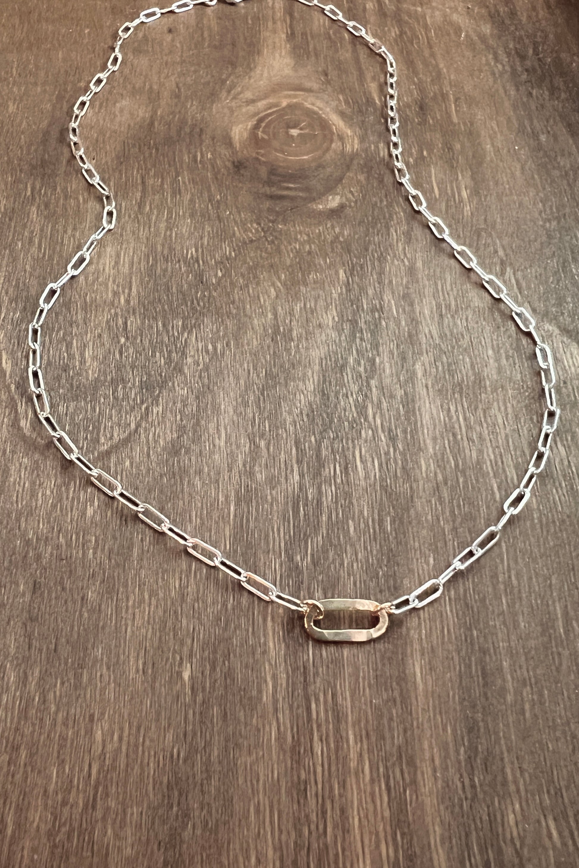 The Small Sovereign mixed metal necklace features shining 6mm x 2.5mm sterling silver links. This rectangle shaped drawn flat cable chain is accented with a gold filled hammered artisan link that is inset in the chain and finished with a large lobster clasp.
