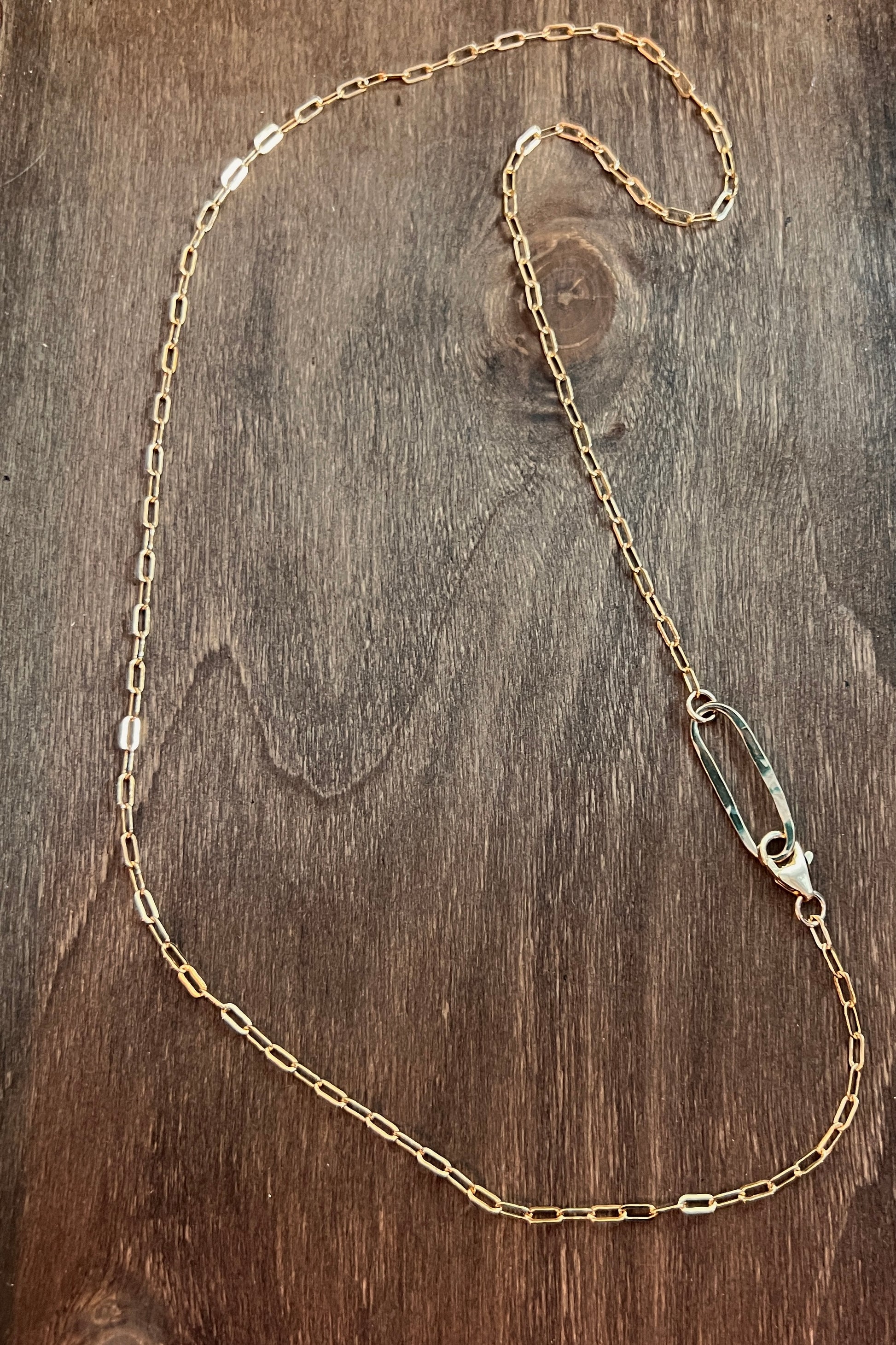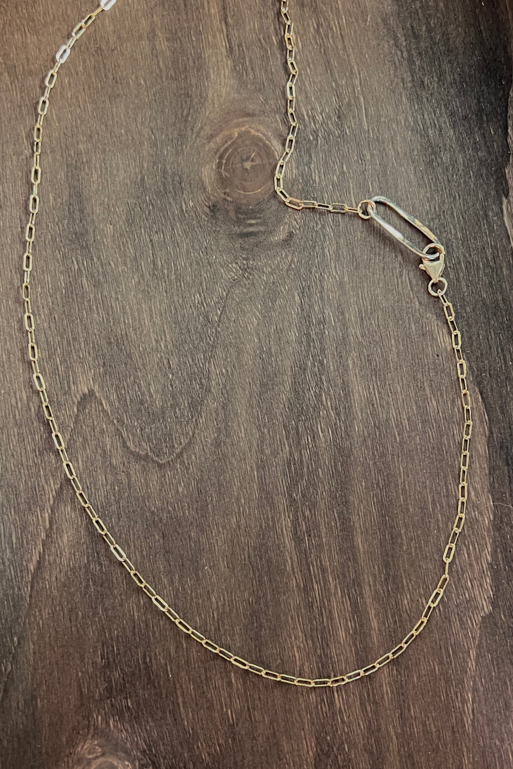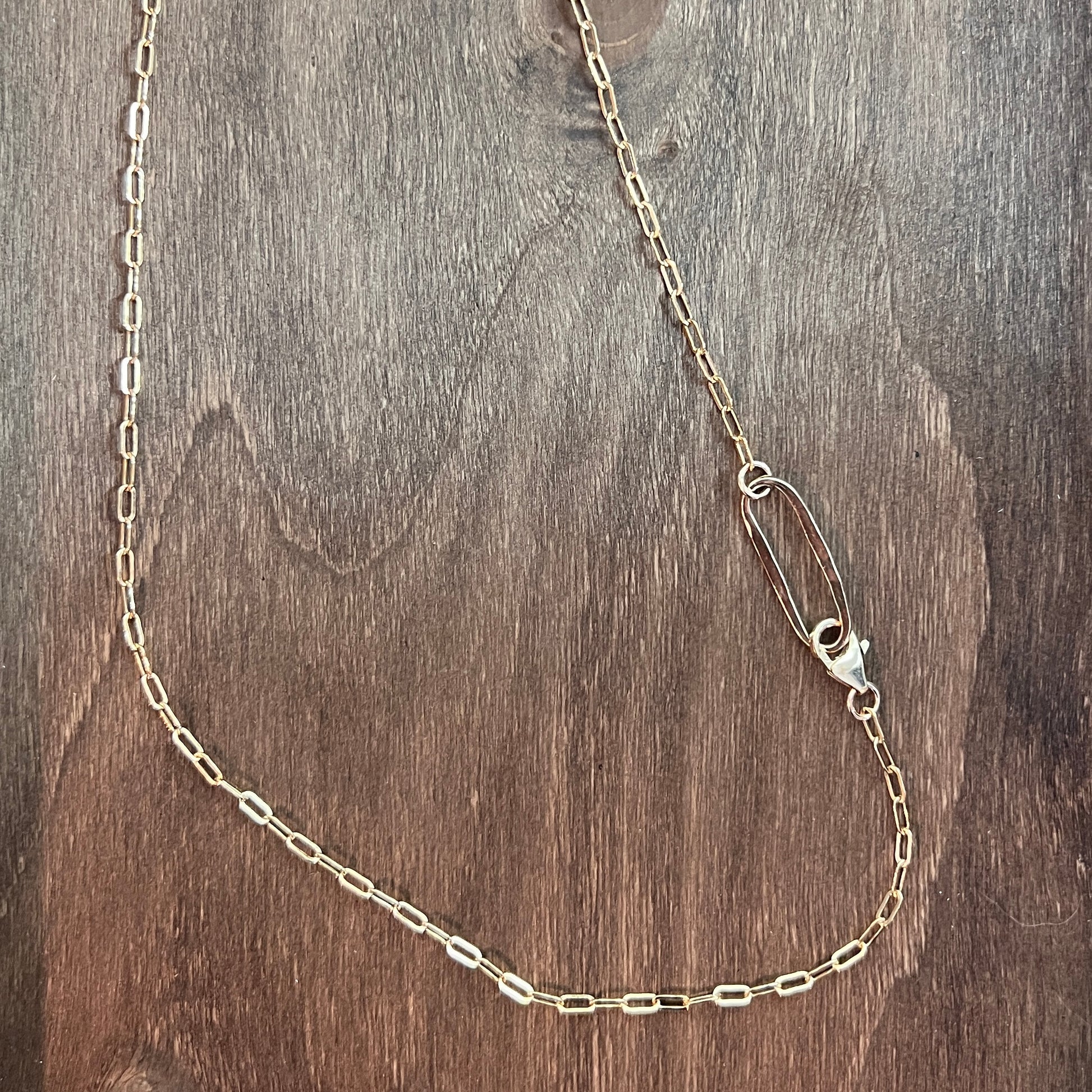 The paperclip chain is still wildly popular and the mixed metal Sovereign Collection offers a fresh and unique option that takes this trend to an even higher level of style. A hand forged hammered link is inset in the chain or used as the eye end of the clasp to add an artistic component not found in a typical paperclip necklace or bracelet.