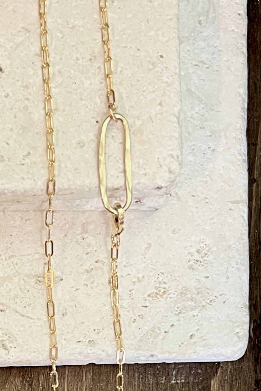 The Small Sovereign necklace features shining 6mm x 2.5mm gold filled links and a longer 22" length. This rectangle shaped drawn flat cable chain is accented with an oversized gold filled hammered artisan eye and finished with a large lobster clasp.