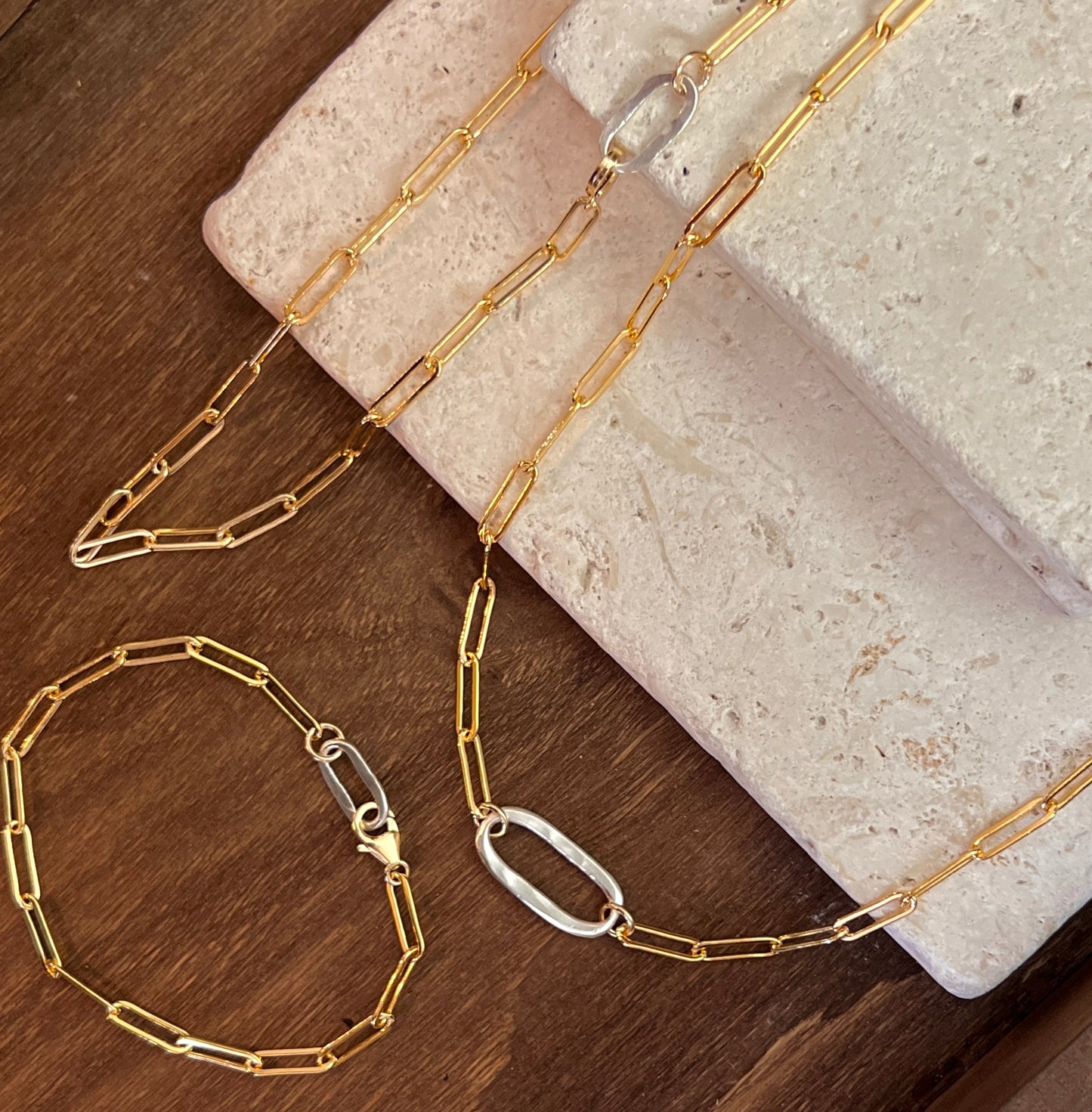 The paperclip chain is still wildly popular and the mixed metal Sovereign Collection offers a fresh and unique option that takes this trend to an even higher level of style. A hand forged hammered link is inset in the chain or used as the eye end of the clasp to add an artistic component not found in a typical paperclip necklace or bracelet.