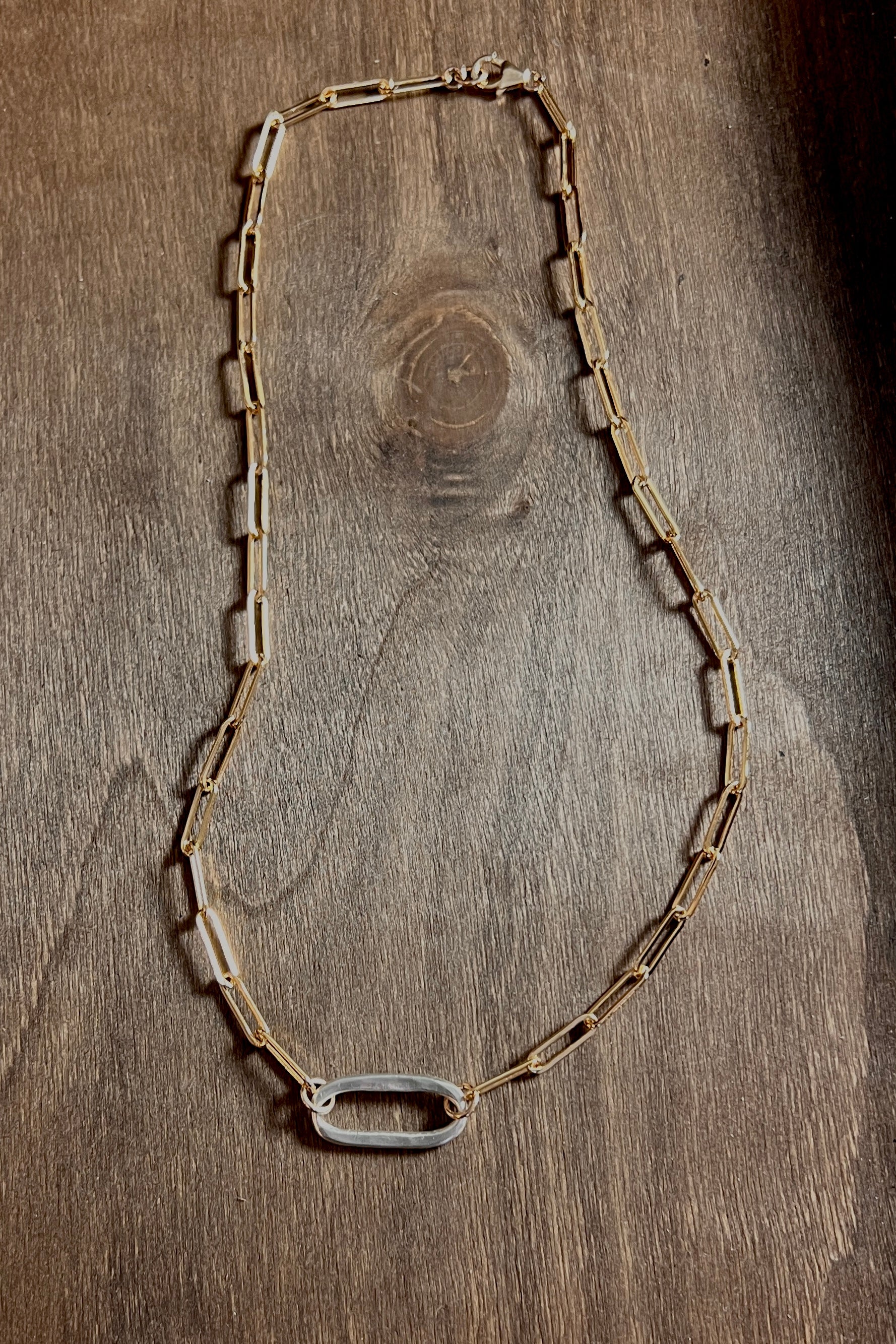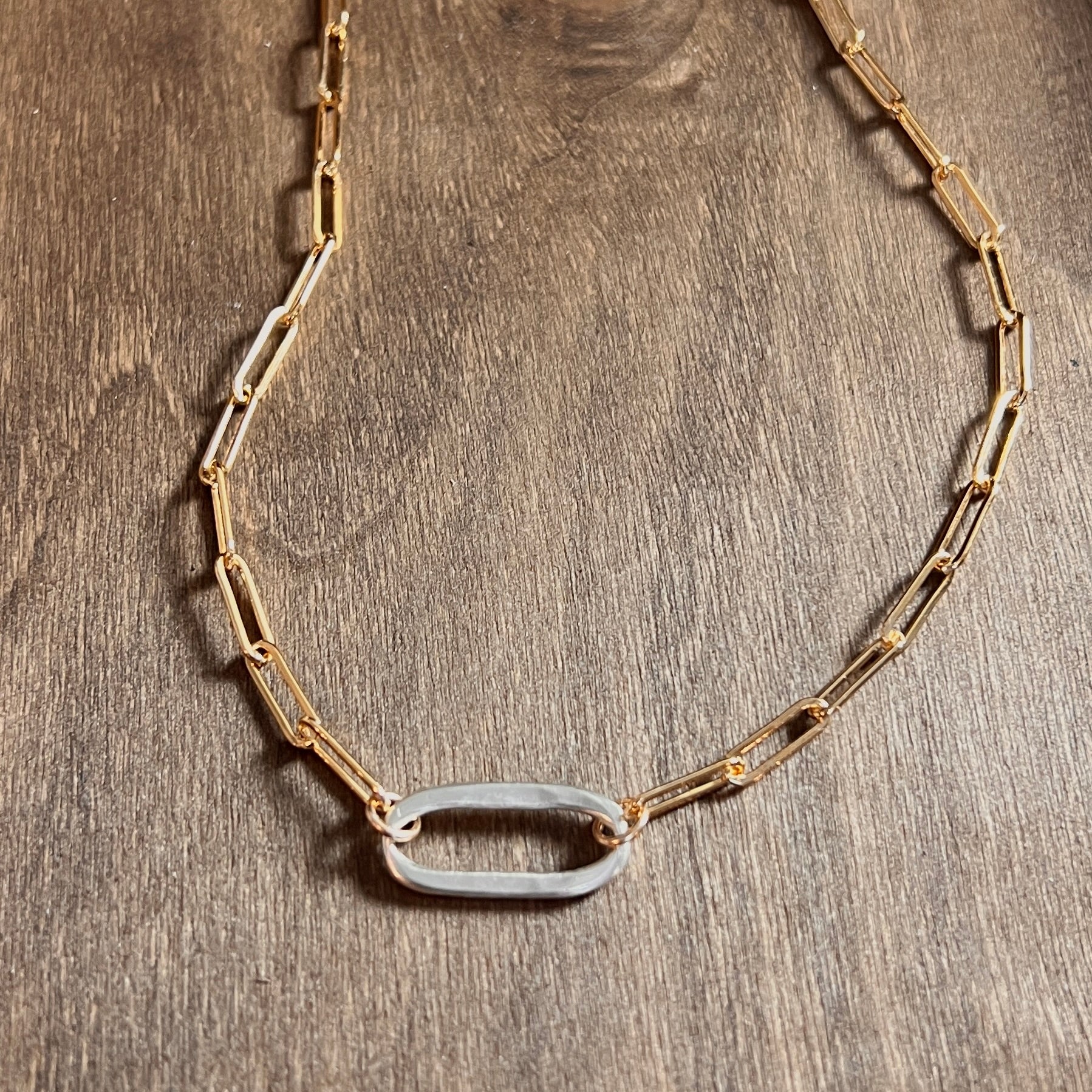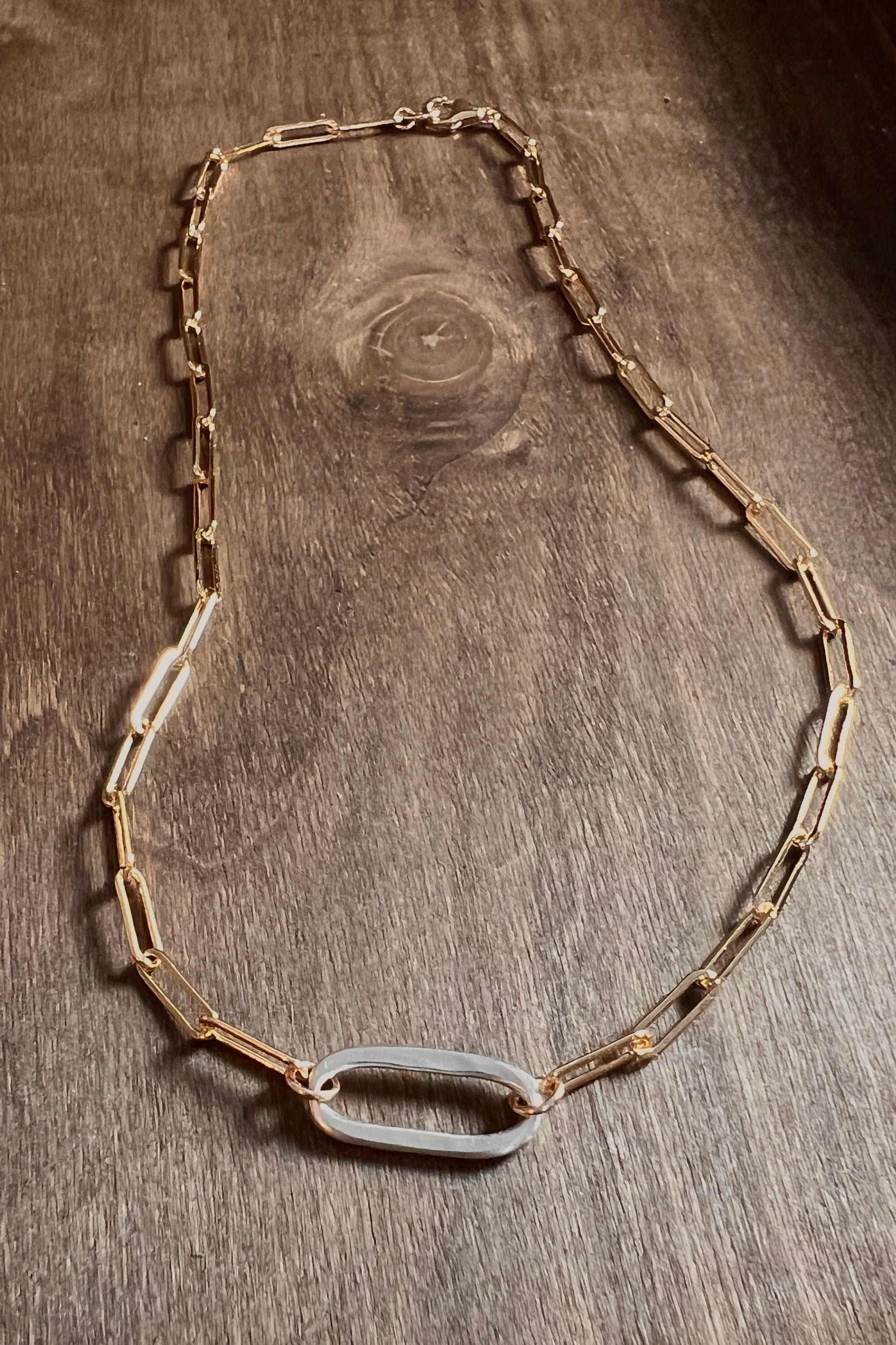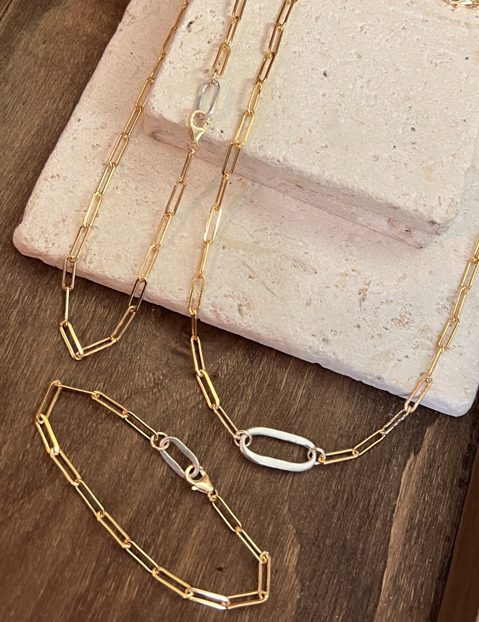 The XL Sovereign mixed metal necklace features shining 13mm x 4mm gold filled links. This rectangle shaped drawn flat cable chain is accented with a sterling silver hammered artisan link that is inset in the chain and finished with a large lobster clasp.
