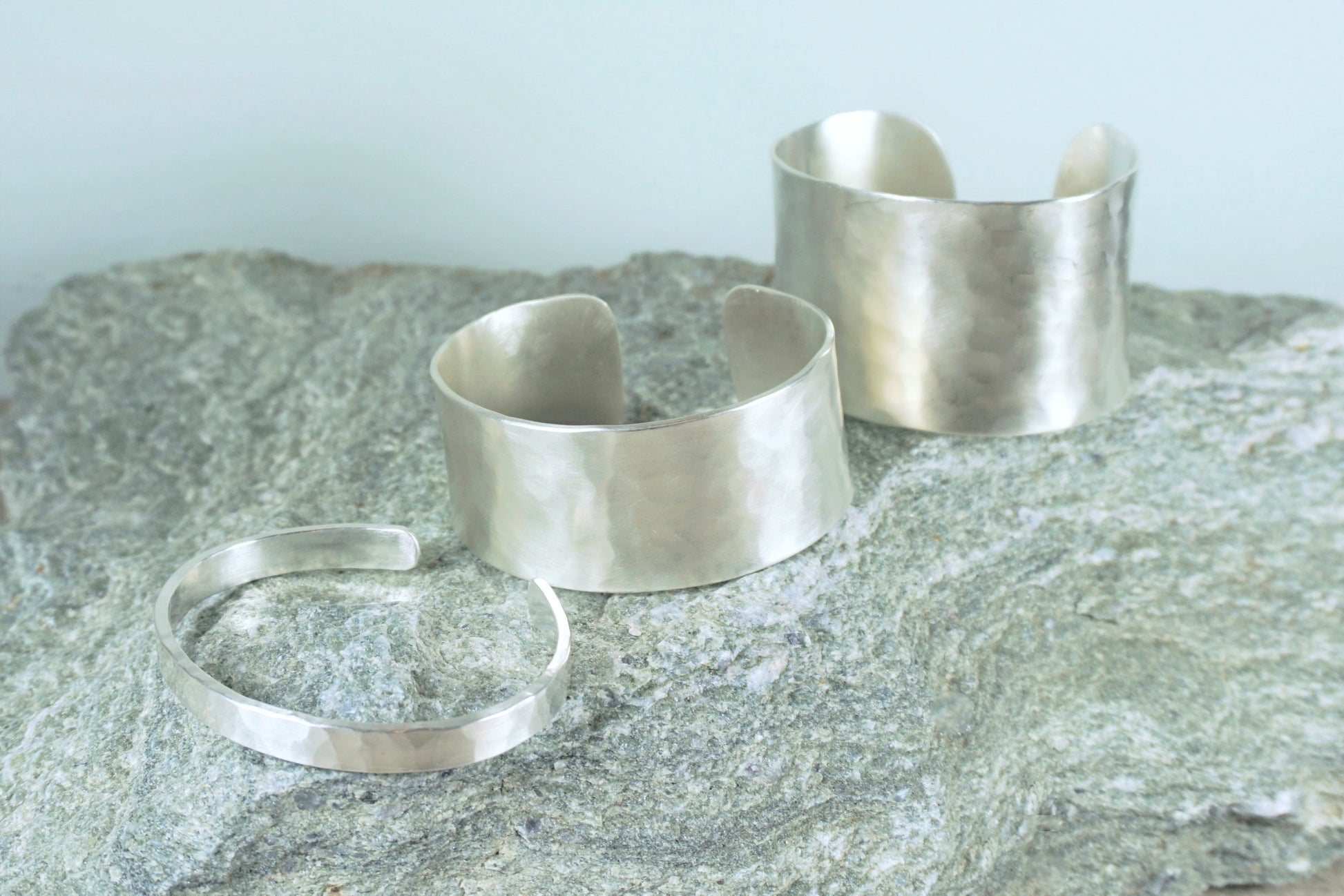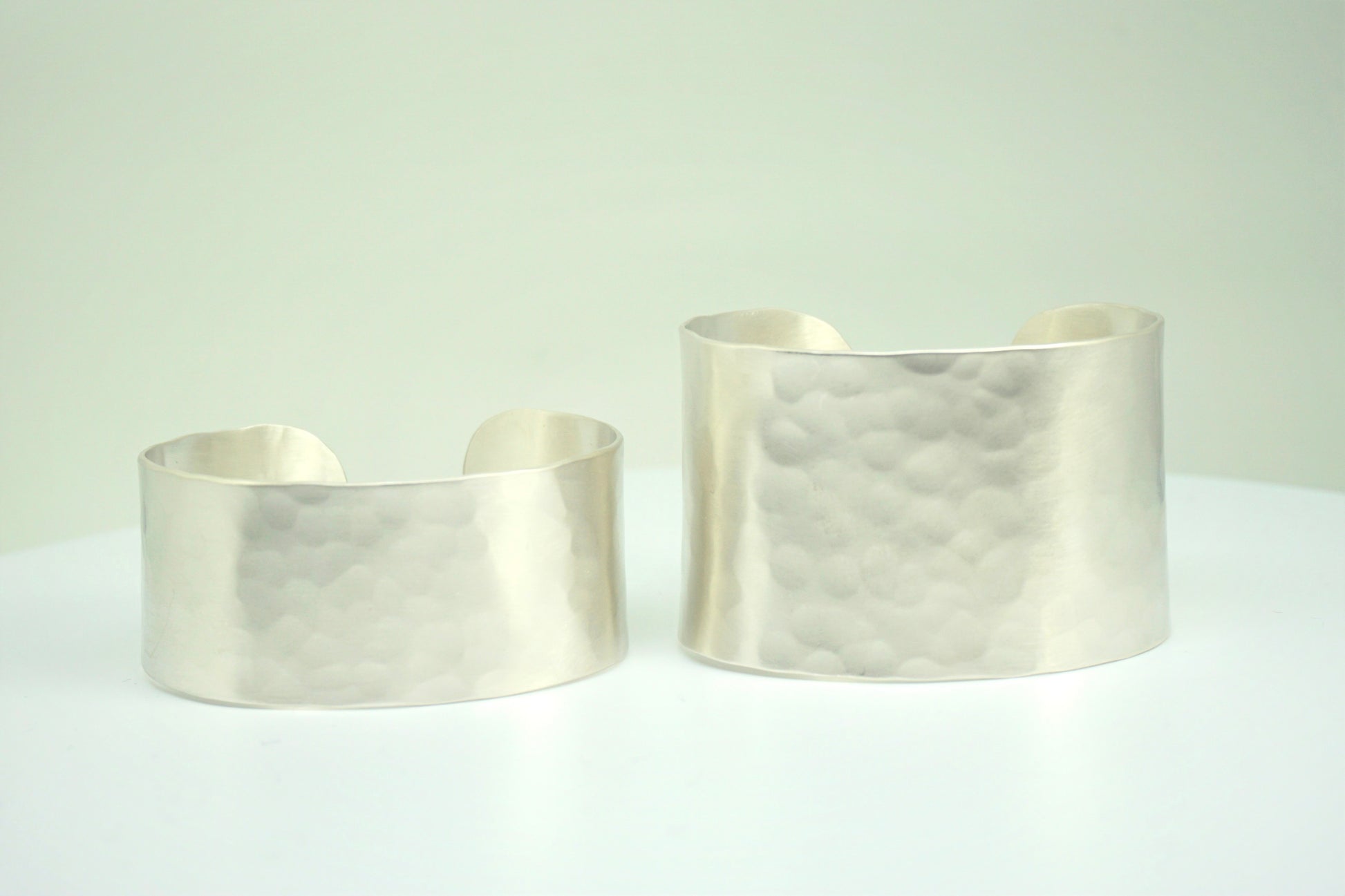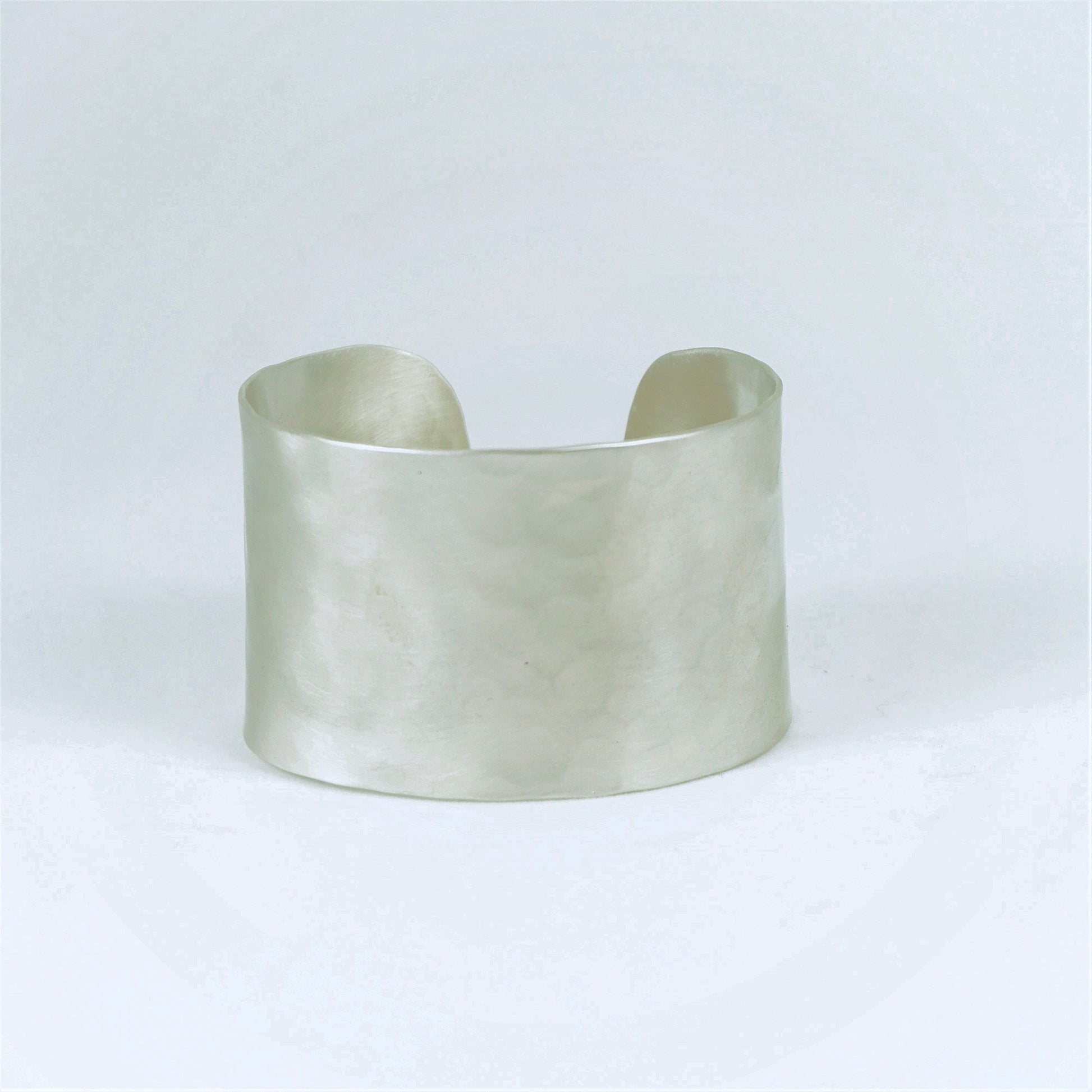 Hand forged 1.5" wide substantial solid sterling silver cuff bracelet. Each cuff is finished with a slight hammered texture and polished to a smooth creamy matte satin that can only be achieved by hand finishing. The end result is a truly unique hand-crafted piece with a rich artisanal component.